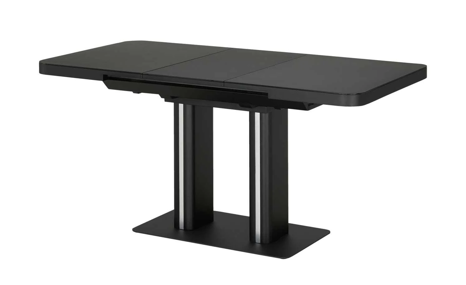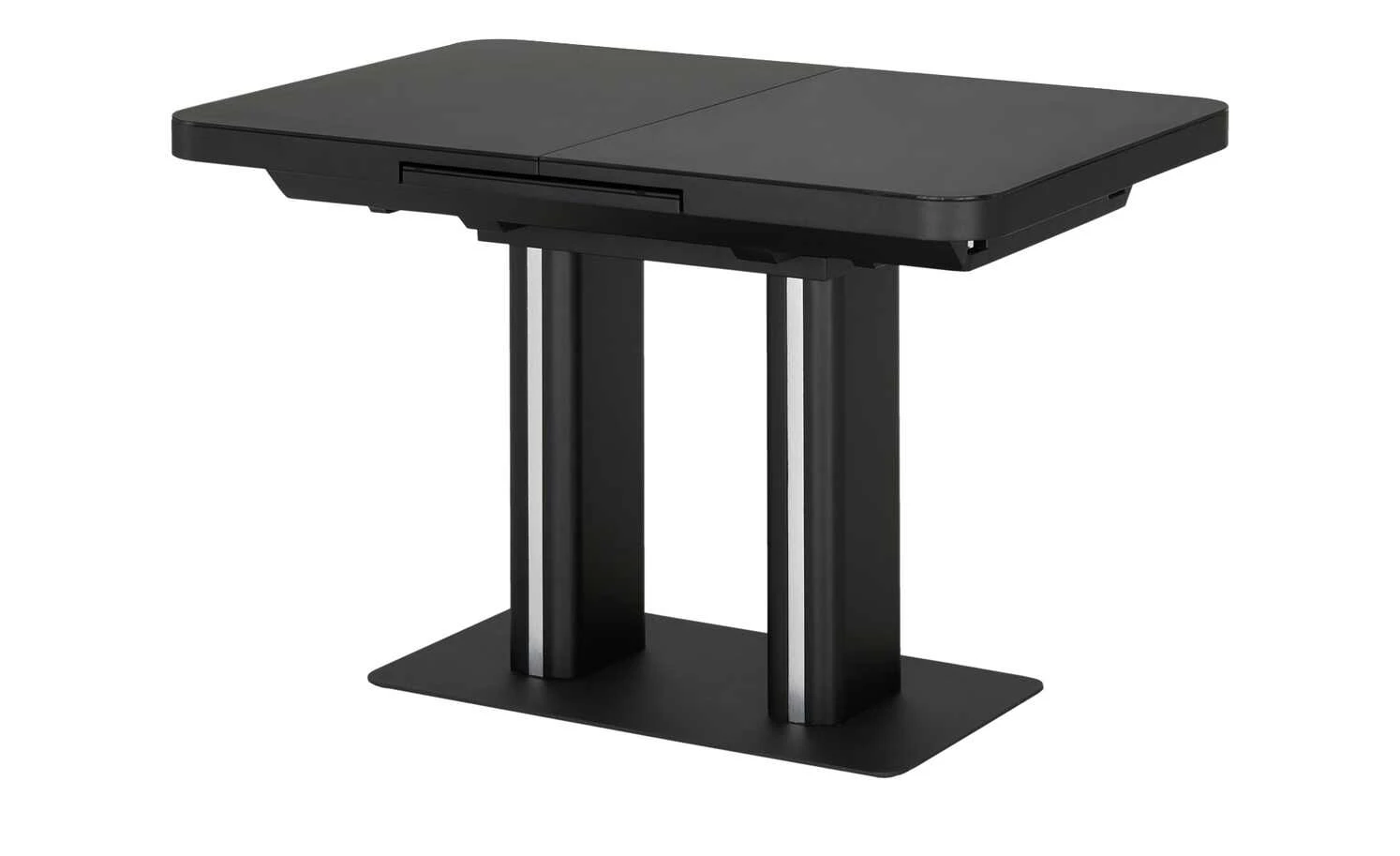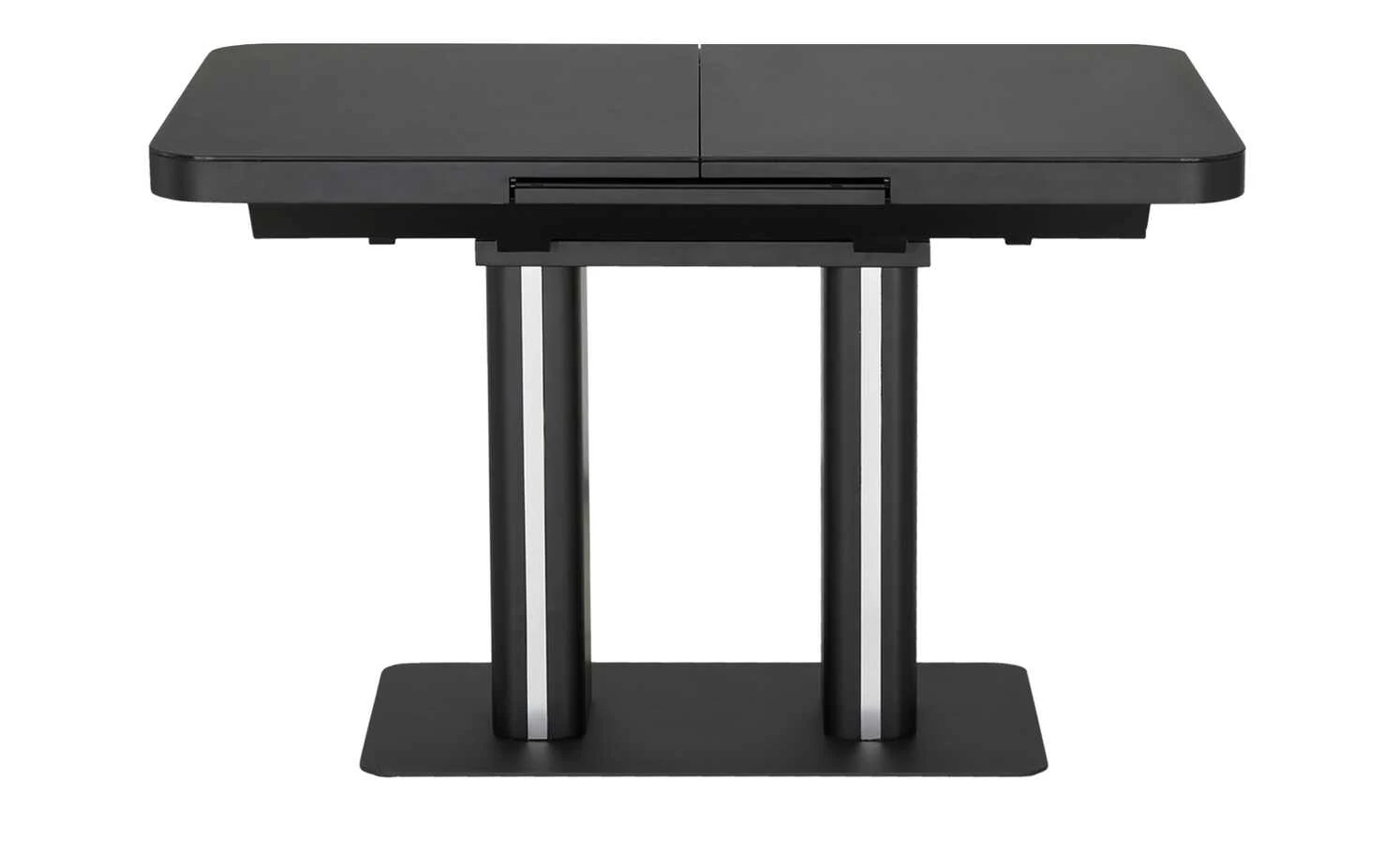 Modern und funktional: Der Esstisch Tizian in Weiß oder Schwarz mit dekorativen Elementen in Edelstahl-Optik. Tizian ist ein ausziehbarer Esstisch und lässt sich durch den integrierten Mittelauszug kinderleicht auf 160 Zentimeter erweitern. Bei Bedarf bietet er dann Platz für bis zu acht Personen. Die Tischplatte hat eine Glasoberfläche und lässt sich dadurch besonders einfach abwischen. Die beiden eckigen Säulentischbeine stehen auf einer Bodenplatte aus Edelstahl und sorgen für ein Plus an Stabilität. Tizian verleiht Ihrem Esszimmer ein modernes und leicht futuristisches Aussehen.