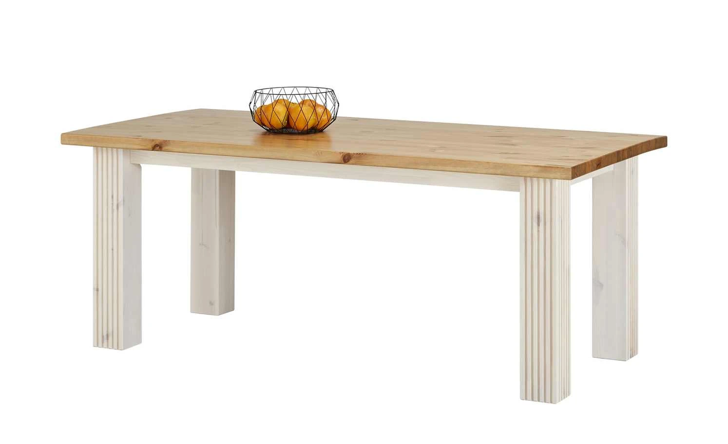 Mit seinem rustikalen Landhauscharme ist der Esstisch Bornholm ein Blickfang für den Essbereich. Bornholm besteht – wie auch die anderen Möbel der Serie – aus massivem Kiefernholz. Die typische Holzmaserung ist sehr gut zu erkennen. Diese natürliche Note passt wunderbar zum Landhauslook. Die vier stabilen Tischbeine sind mit vertikalen Rillen verziert.