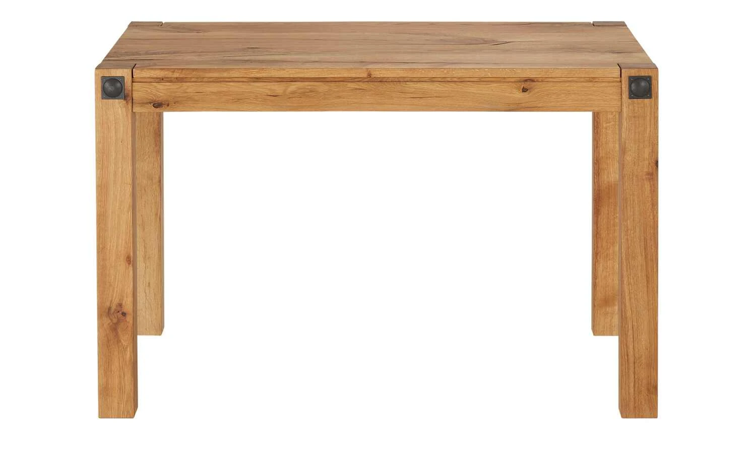 Der robuste Esstisch aus der Serie Freddy bietet Ihnen Platz für vier Personen. Die Oberfläche wurde geölt, um dem Tisch eine antik-wirkende Optik zu verleihen. Die natürliche Struktur des Holzes mit Rissen, Unebenheiten und der typischen Maserung ist dennoch gut zu erkennen. Am oberen Ende der Tischbeine in Höhe der Tischplatte sind dunkle Eisenbeschläge angebracht, die dem Tisch eine rustikale Note verleihen.