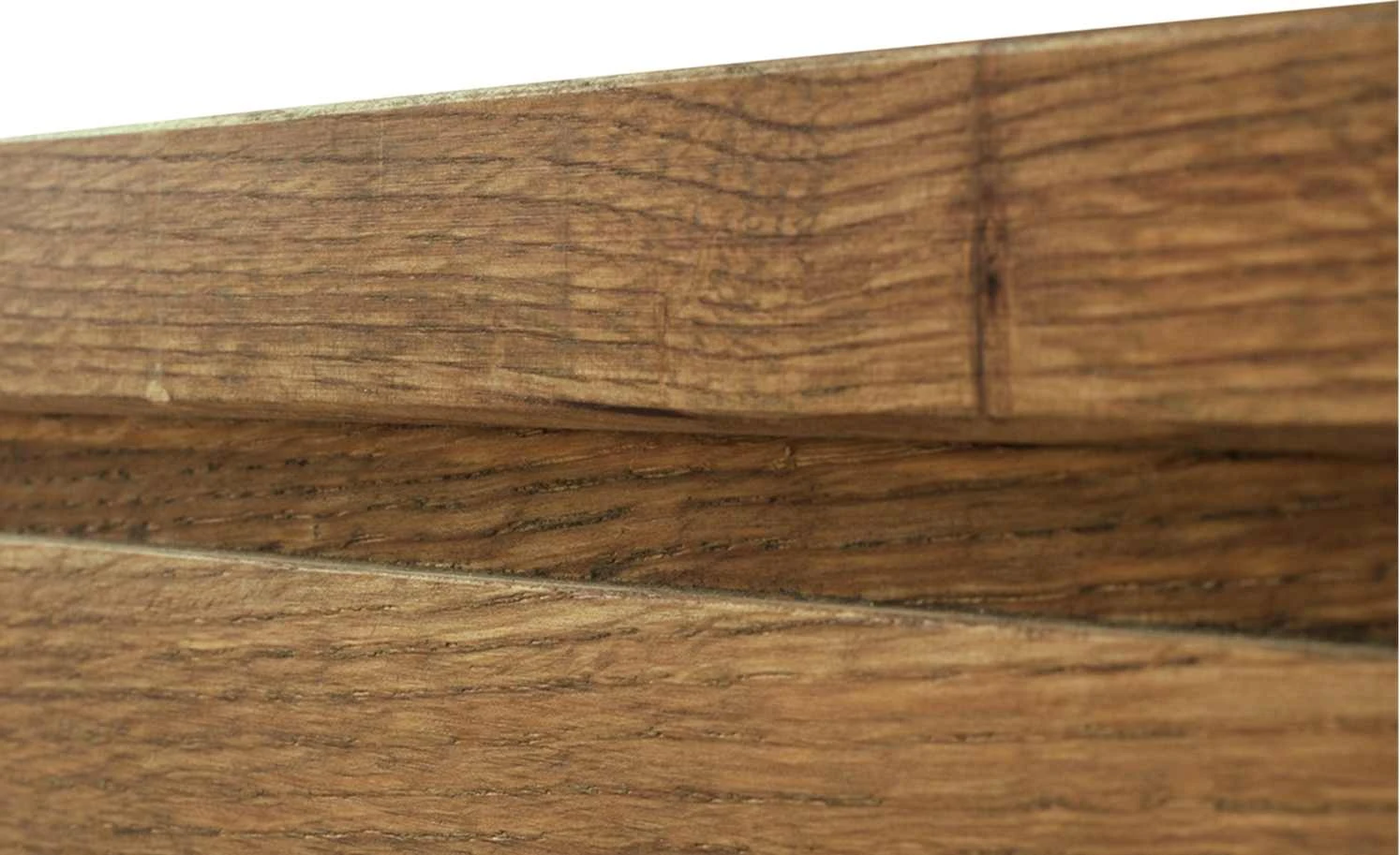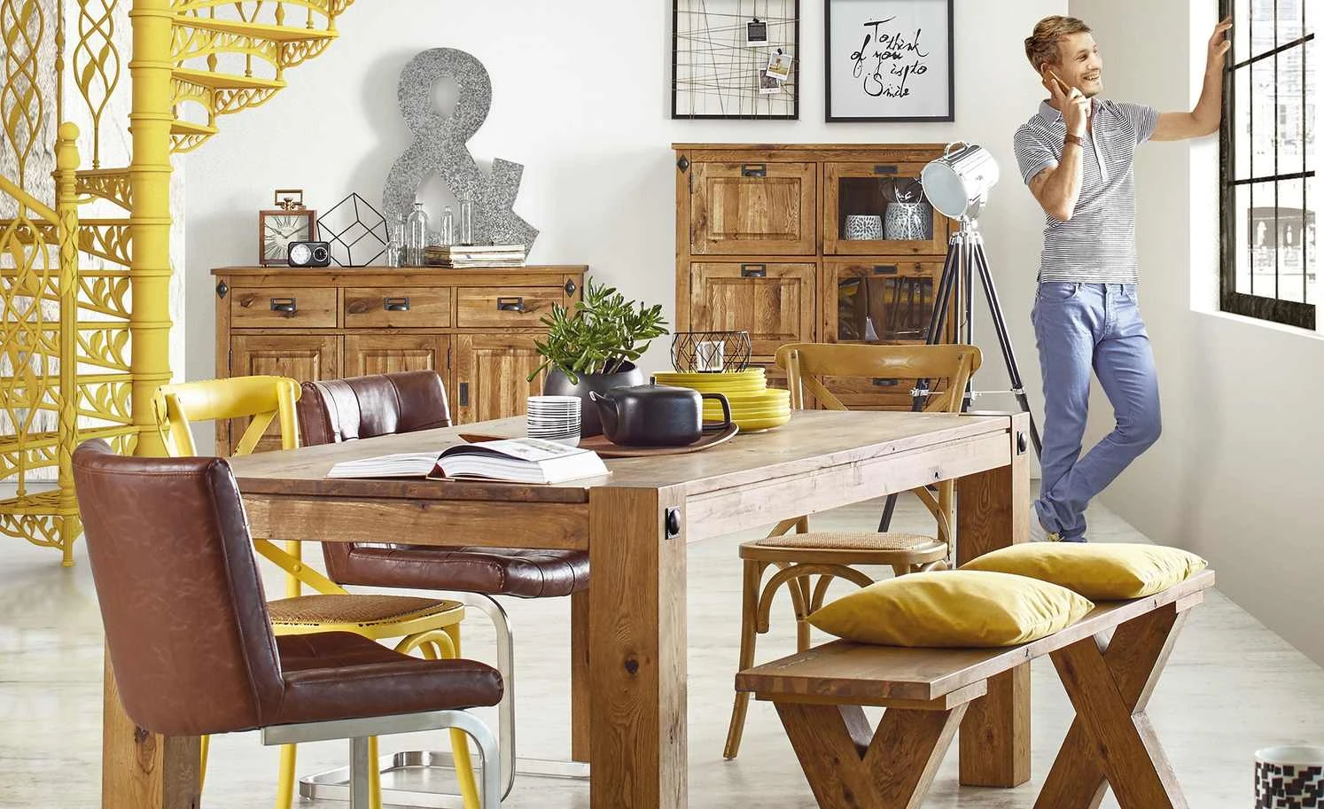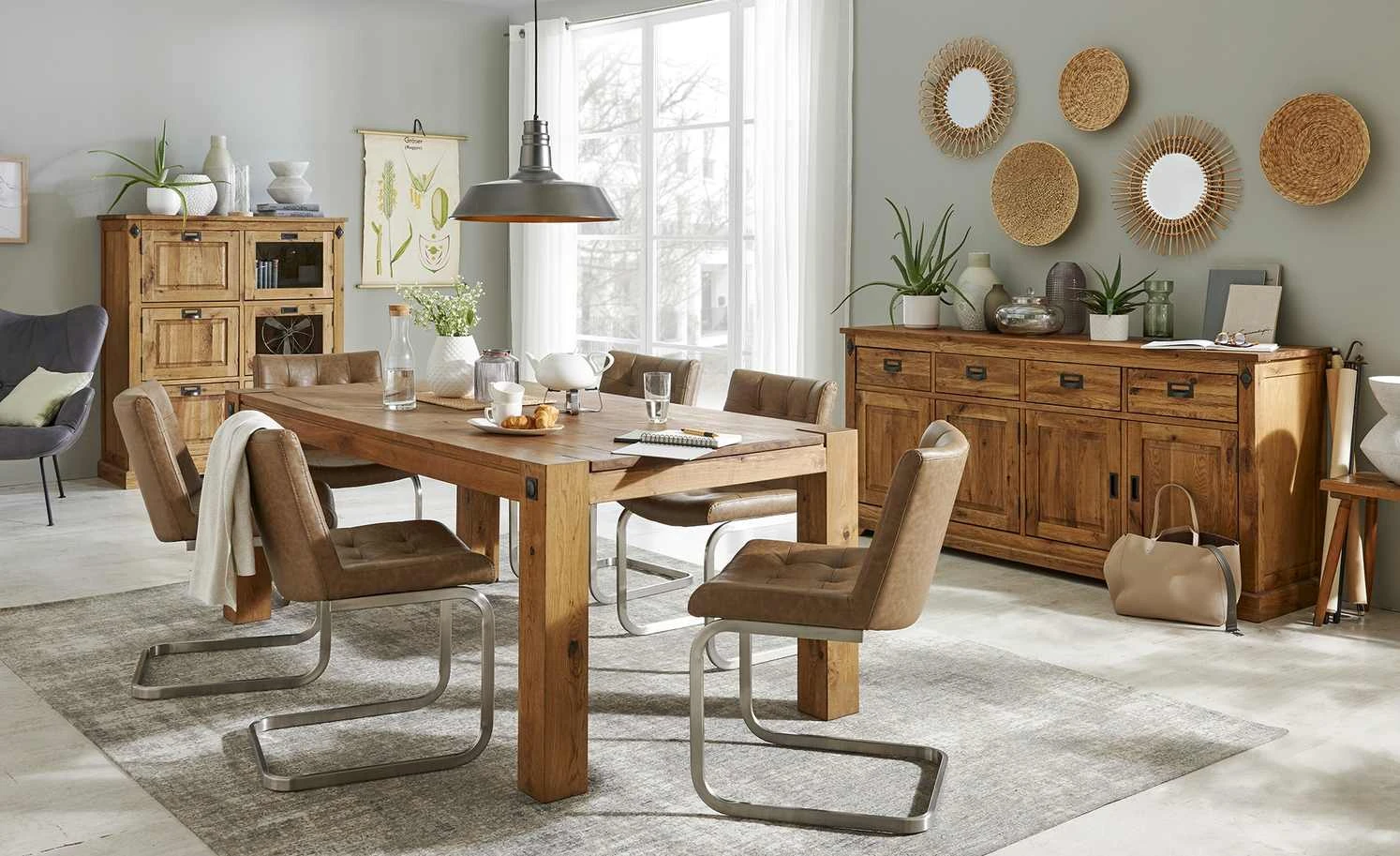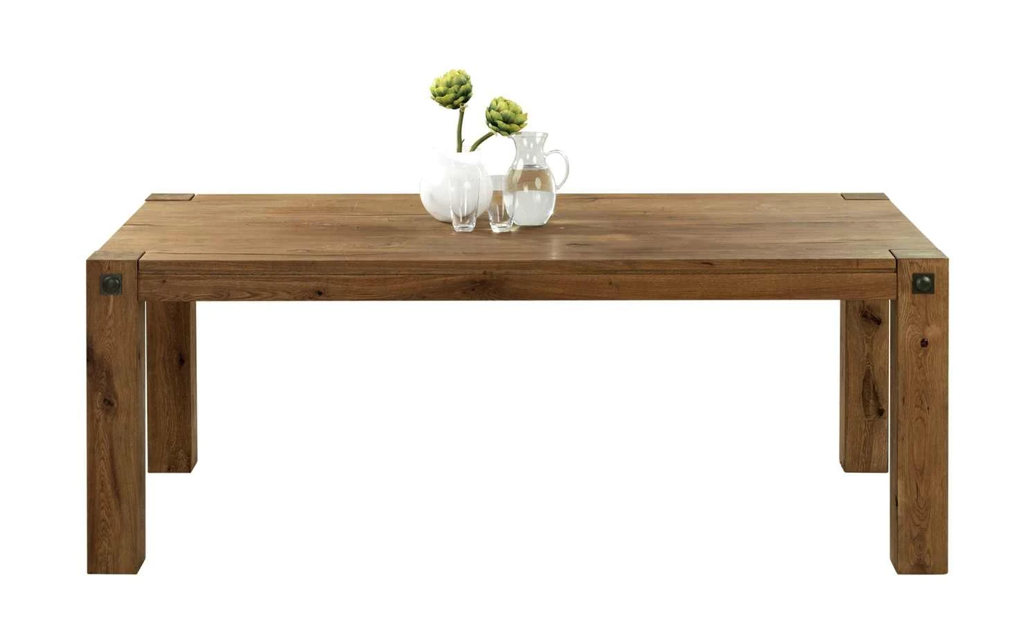Der robuste Esstisch aus der Serie Freddy bietet Ihnen Platz für acht Personen. Die Oberfläche wurde geölt, um dem Tisch eine antik-wirkende Optik zu verleihen. Die natürliche Struktur des Holzes mit Rissen, Unebenheiten und der typischen Maserung ist dennoch gut zu erkennen. Am oberen Ende der Tischbeine in Höhe der Tischplatte sind dunkle Eisenbeschläge angebracht, die dem Tisch eine rustikale Note verleihen.