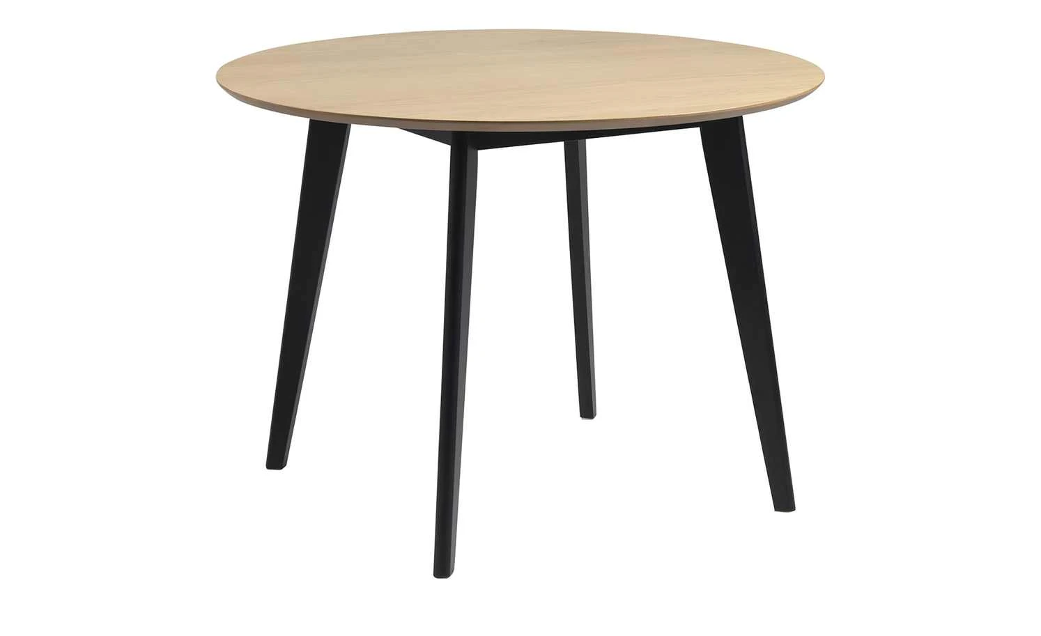 Der Esstisch Robin setzt mit seinem schwarzem Gestell und seiner hellen Tischplatte einen bewussten Kontrast. Die runde Tischplatte in heller Eichenoptik besitzt einen Durchmesser von 105 Zentimetern und bietet bequem für vier Personen Platz. Das schwarze Tischgestell mit den vier Beinen ist aus Massivholz und damit besonders robust. Alle Oberflächen sind lackiert, sodass Sie Flecken ganz leicht abwischen können.