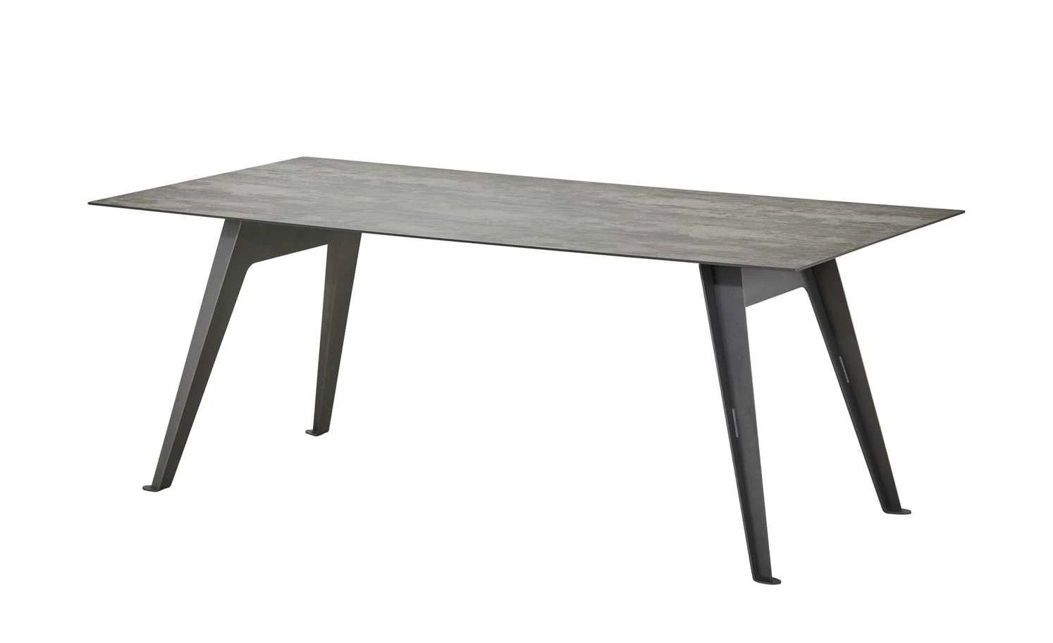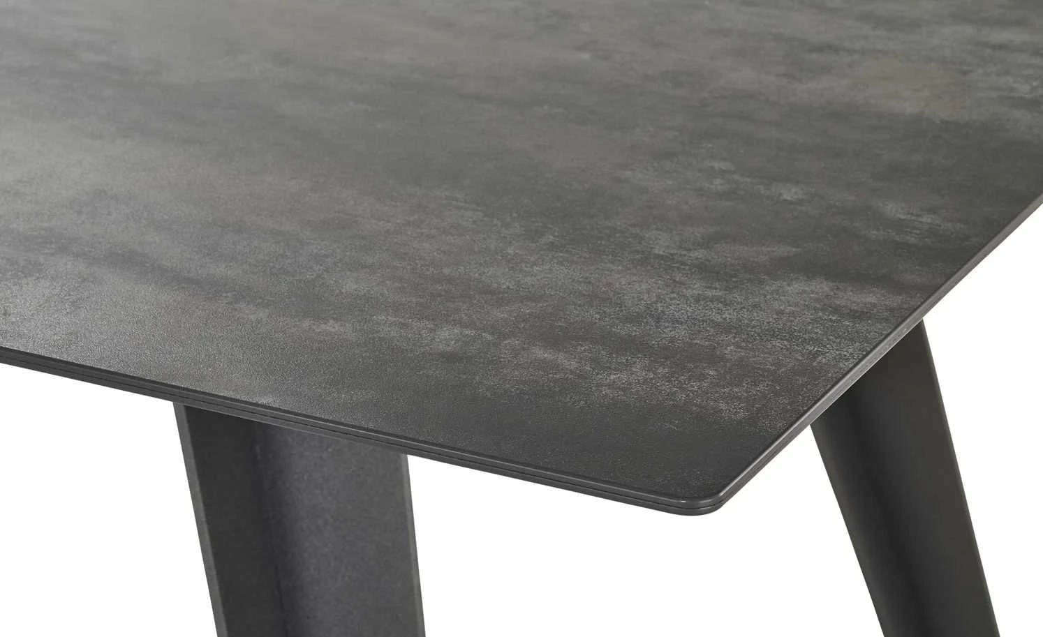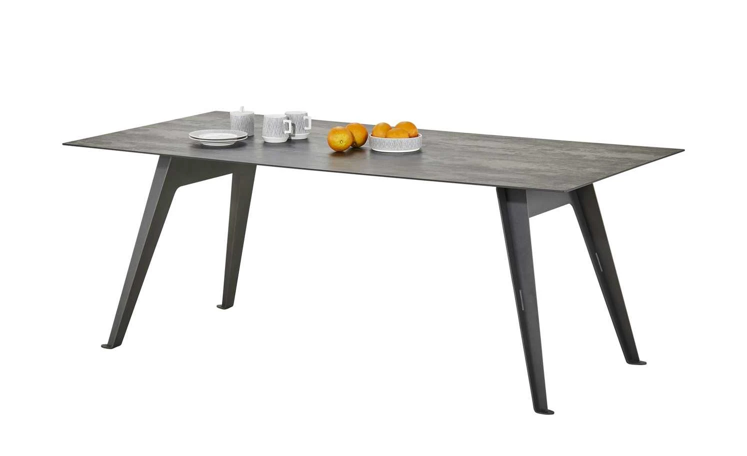 Keramik ist ein tolles Material – auch für Möbel. Beim Design-Esstisch Sato besteht die Tischplatte aus hochwertiger dunkelgrauer Keramik. Die Oberfläche changiert in diversen Farbnuancen, was einen tollen Effekt ergibt. Das Gestell ist aus lackiertem Stahl. Die vier Beine sind leicht schräg gestellt, um den Stand des Tisches noch stabiler zu machen.