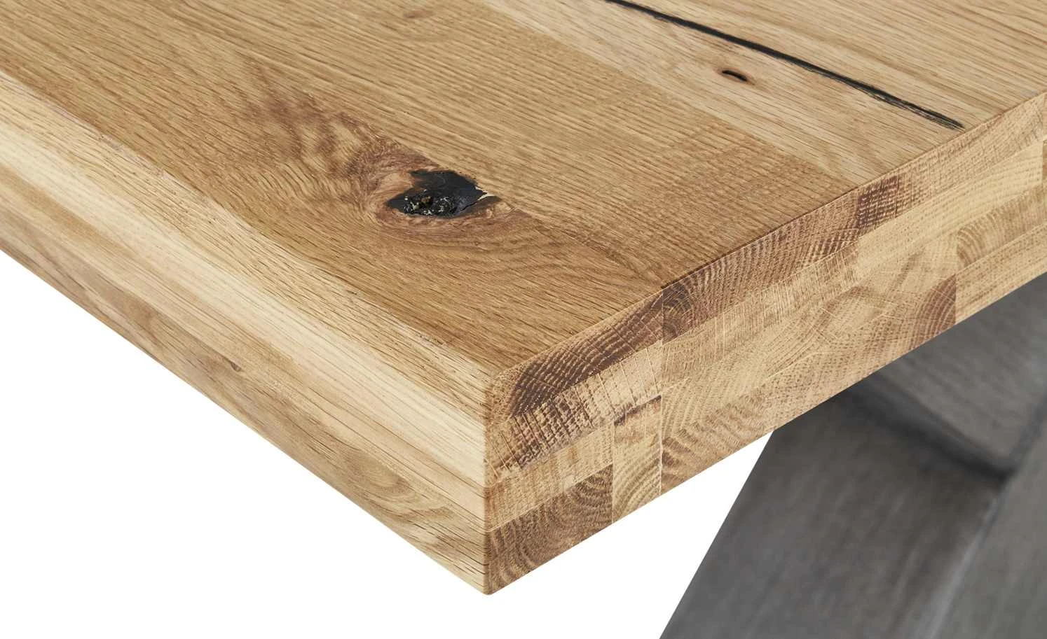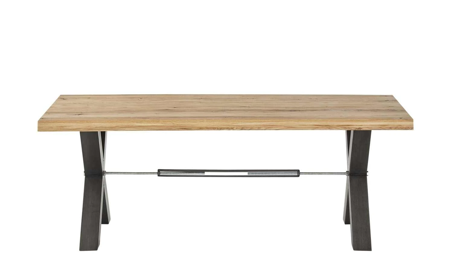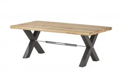 Industrial-Charme im Esszimmer? Den erhalten Sie mit dem Esstisch Todd, der durch seinen Mix aus Holz und Metall auffällt. Die Tischplatte in 200×100 Zentimetern Größe bietet Platz für zehn Personen. Sie ist aus massiver Wildeiche gefertigt. Die Holzoberfläche wird durch ein Spezialöl versiegelt. Es hebt die natürliche Maserung des Holzes hervor. Sie besticht mit ihrem rustikalen Charme mit Farbunterschieden, Rissen und Asteinschlüssen. Das Gestell besteht aus lackiertem, grauem Metall. Die zwei Elemente in X-Form werden durch eine Strebe verbunden.