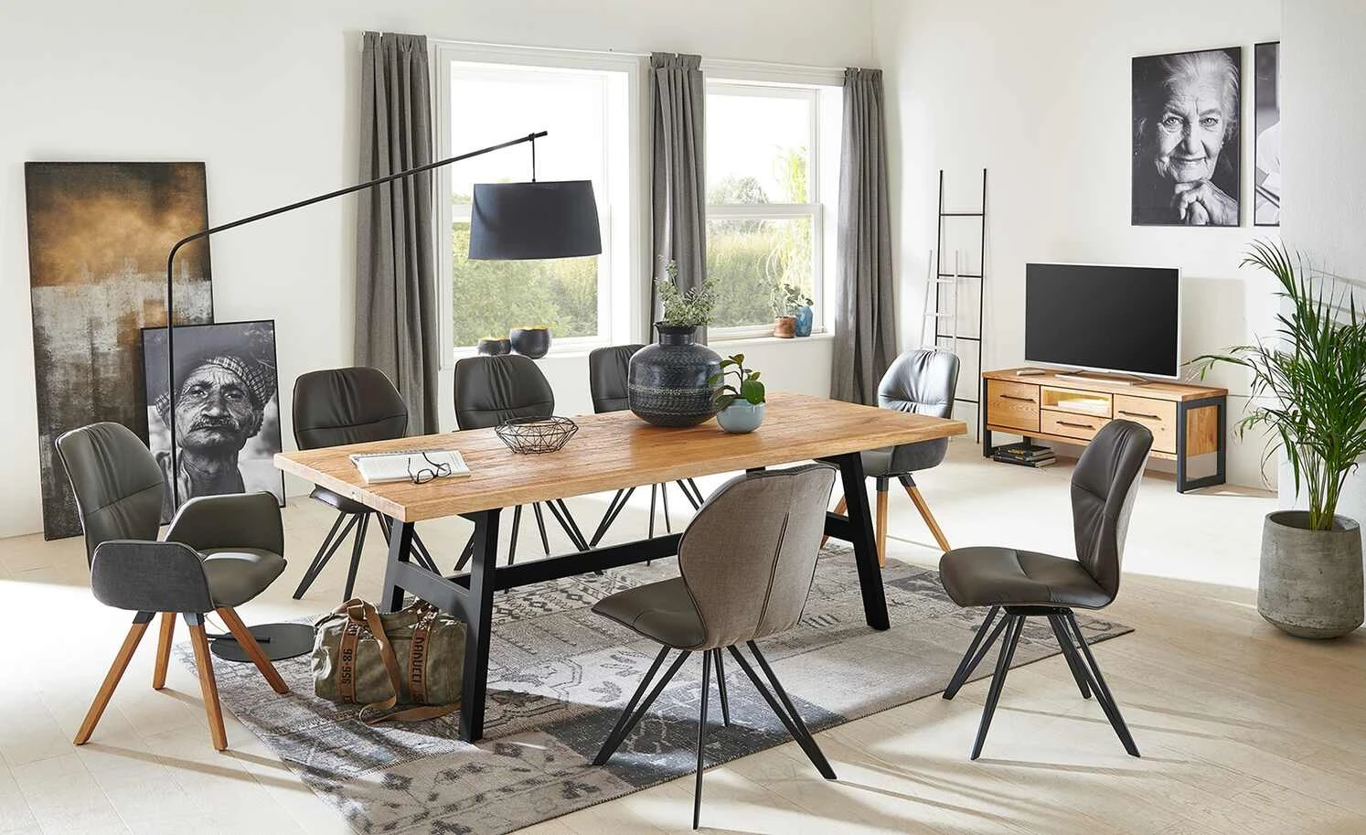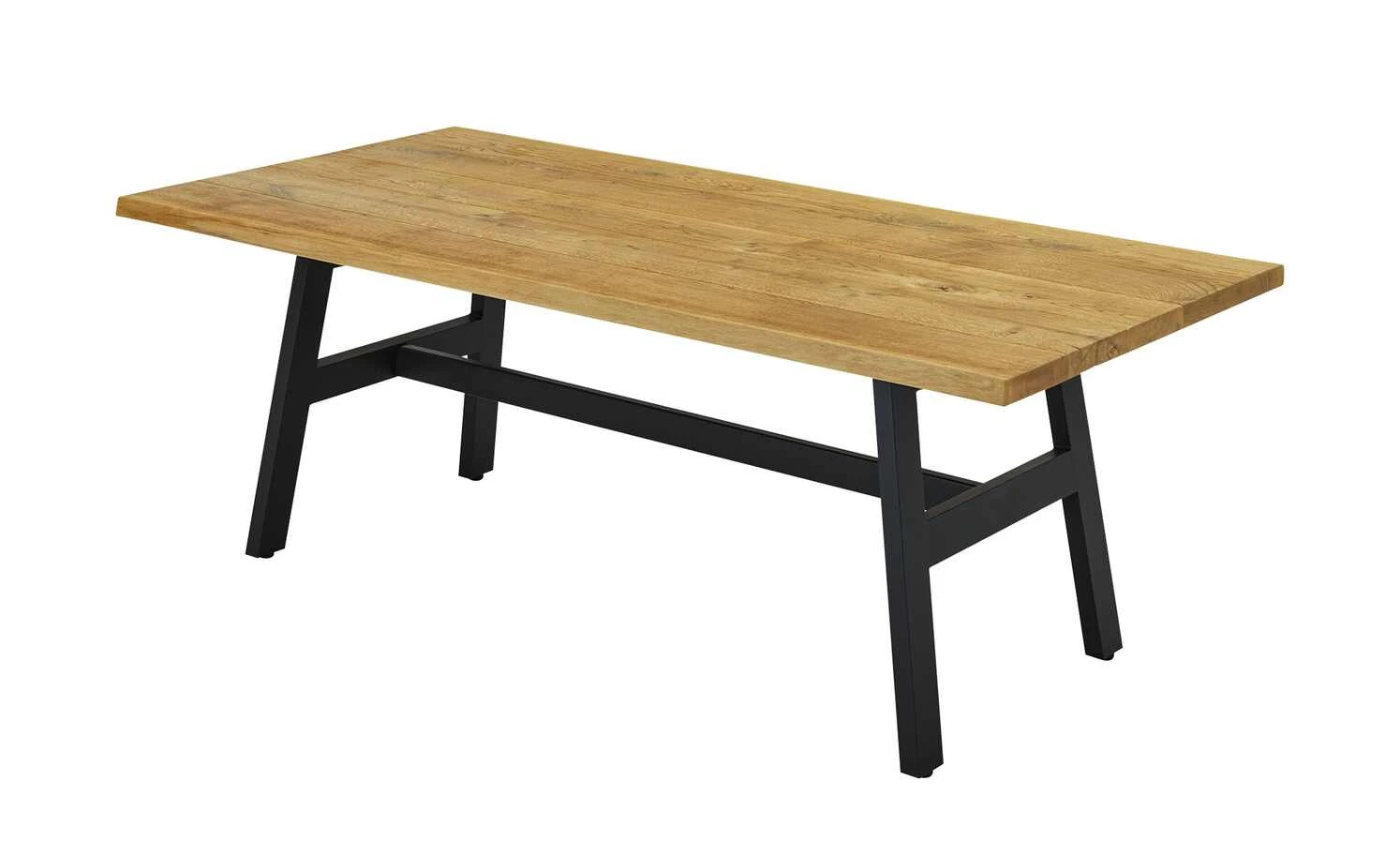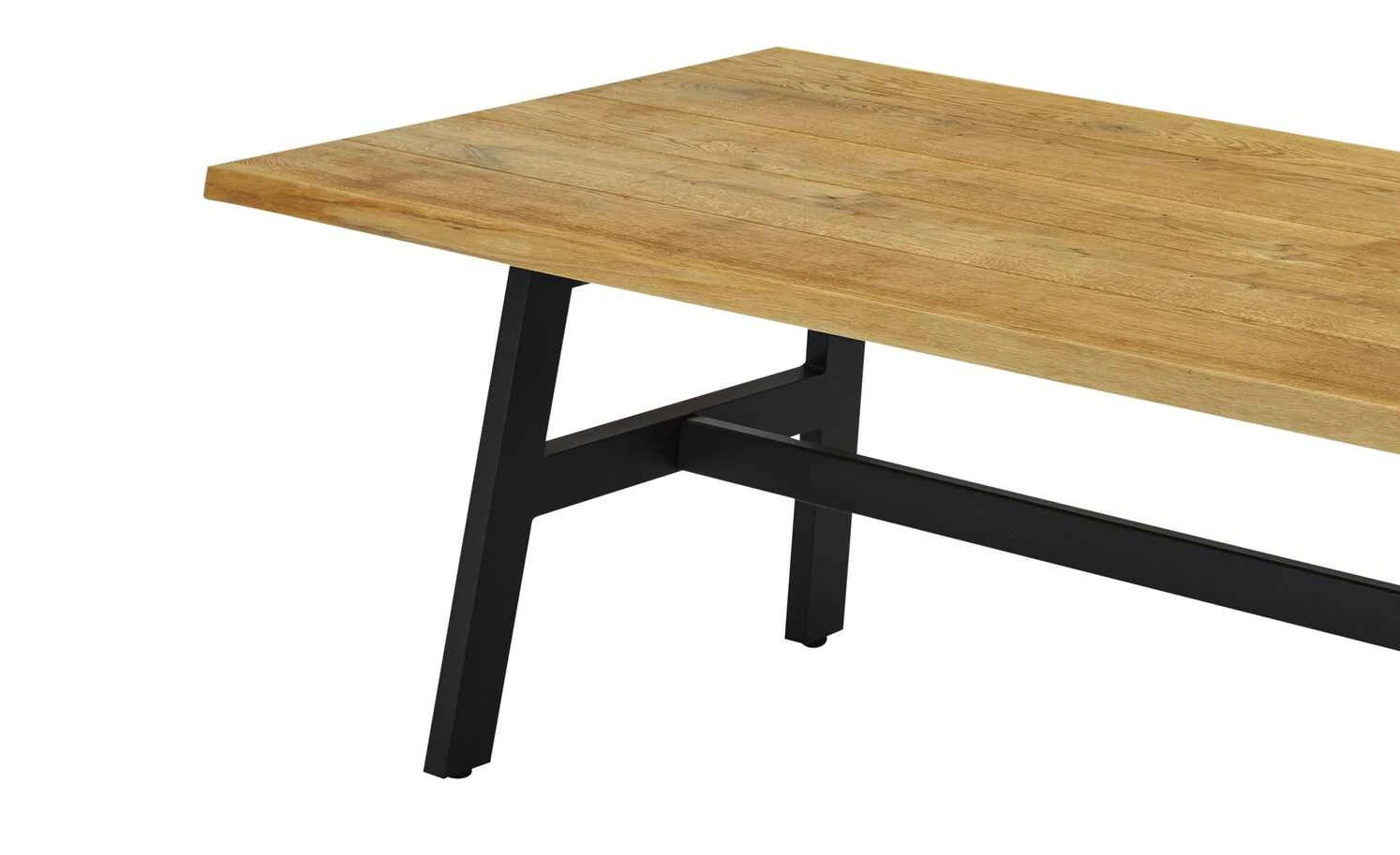 - Mehr zur Ausführung: Mit Baumkante – jeder Tisch ein Unikat!, Tischplatte aus Barock-Eiche massiv, Derbe Eiche mit Plankenkerbe, sowie urwüchsigen Ästen und Strukurmerkmalen, Eisen H-Gestell mit Steg