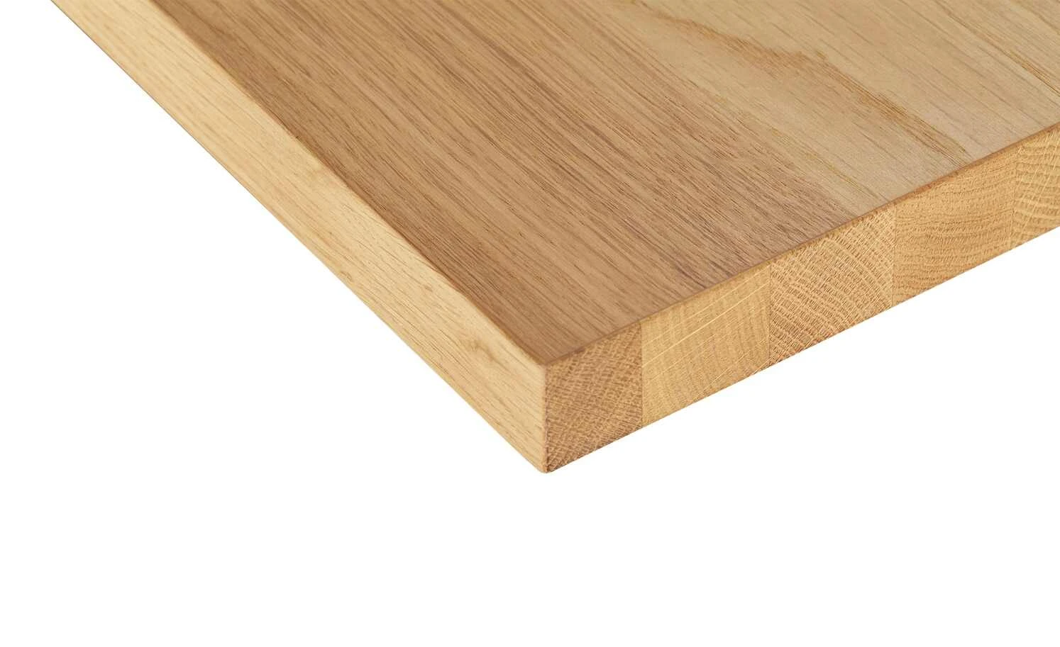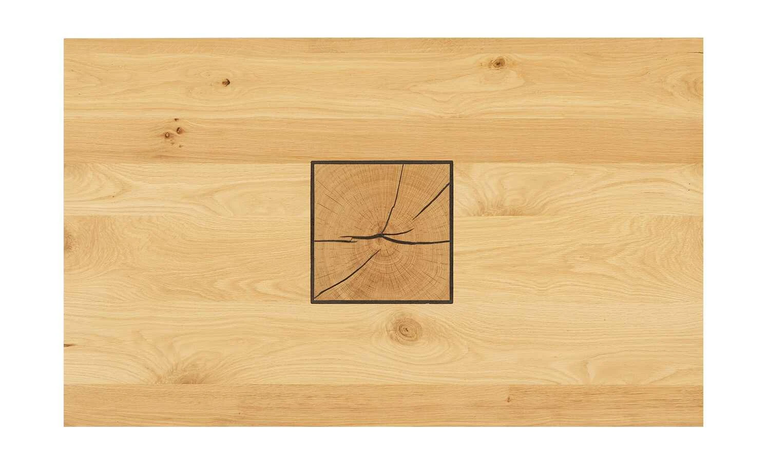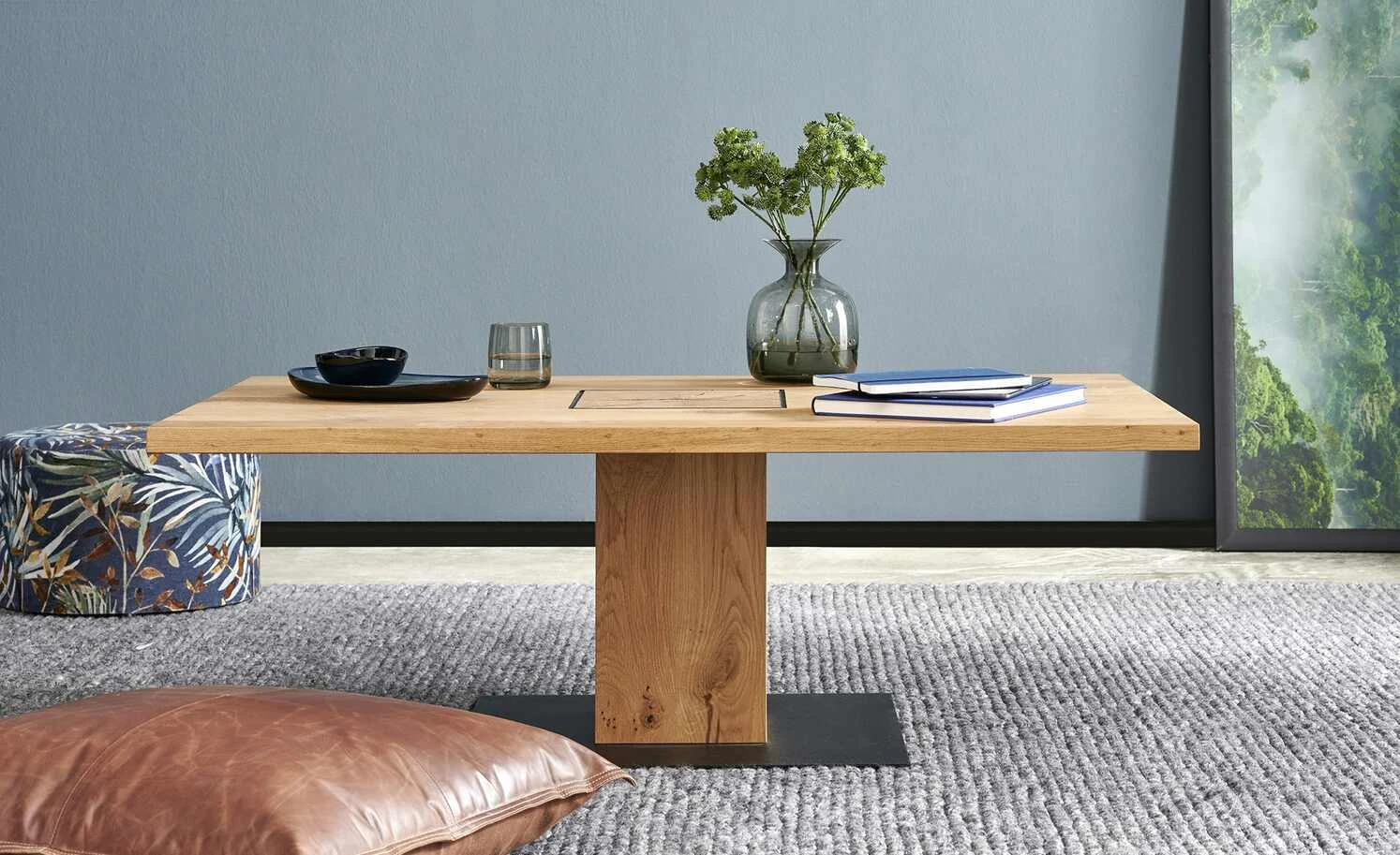 - Mehr zum Material: Bodenplatte: Metall Schwarz lackiert, Tischplatte und Säule: Wildeiche furniert, geölt