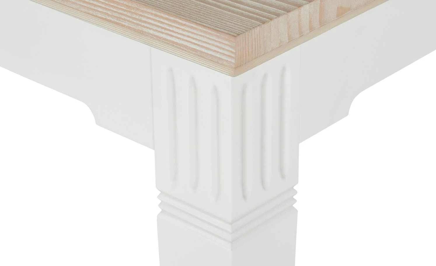 - Mehr zum Material: Gestell: MDF (Mitteldichte Faserplatte) lackiert in Weiß, Tischplatte: Fichte furniert, gebürstet und gekälkt in Antik Braun