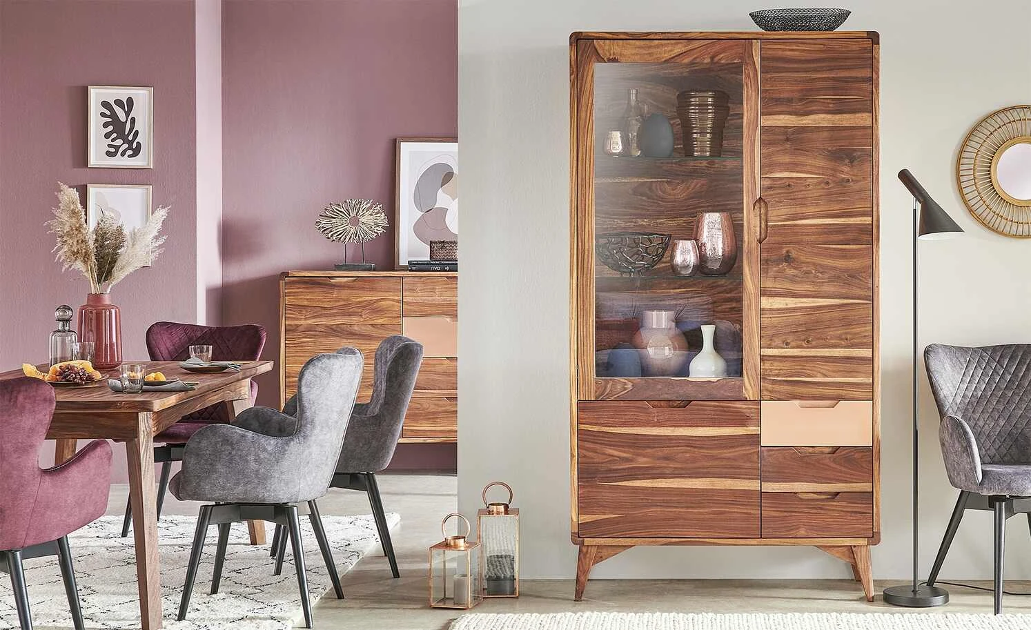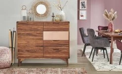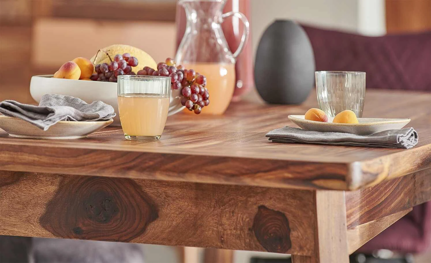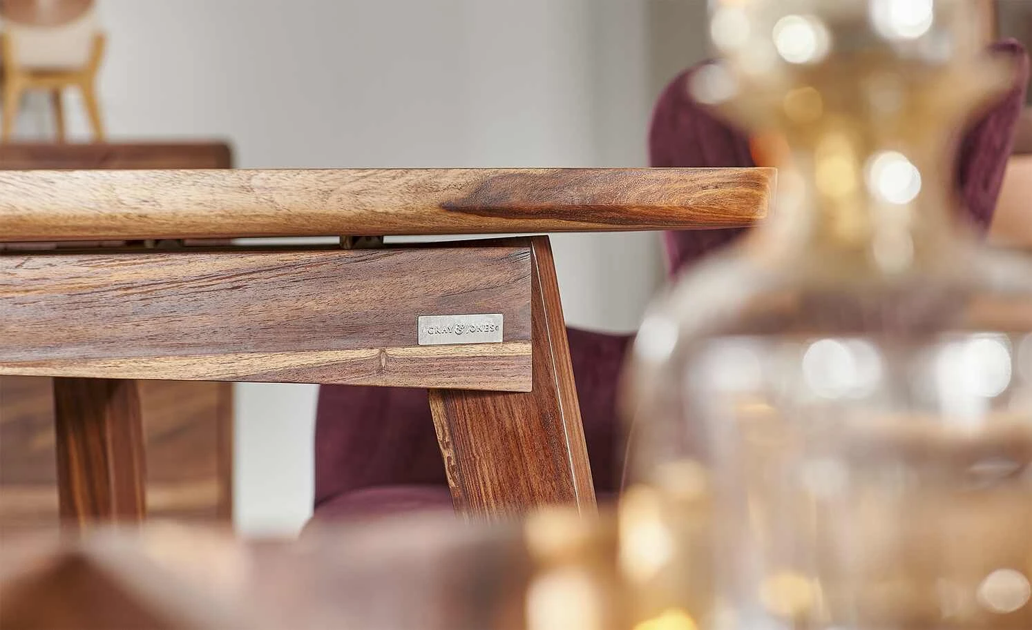 - Mehr zum Material: Tischplatte und Gestell in Sheesham furniert, Lackbeschichtung Natur