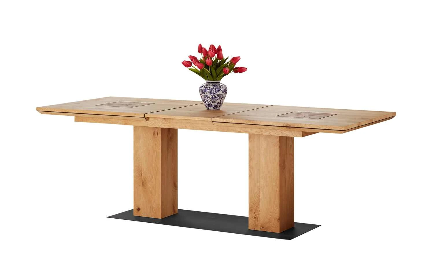 - Mehr zum Material: Bodenplatte: Metall Schwarz lackiert, Tischplatte und Säulen: Wildeiche furniert, geölt