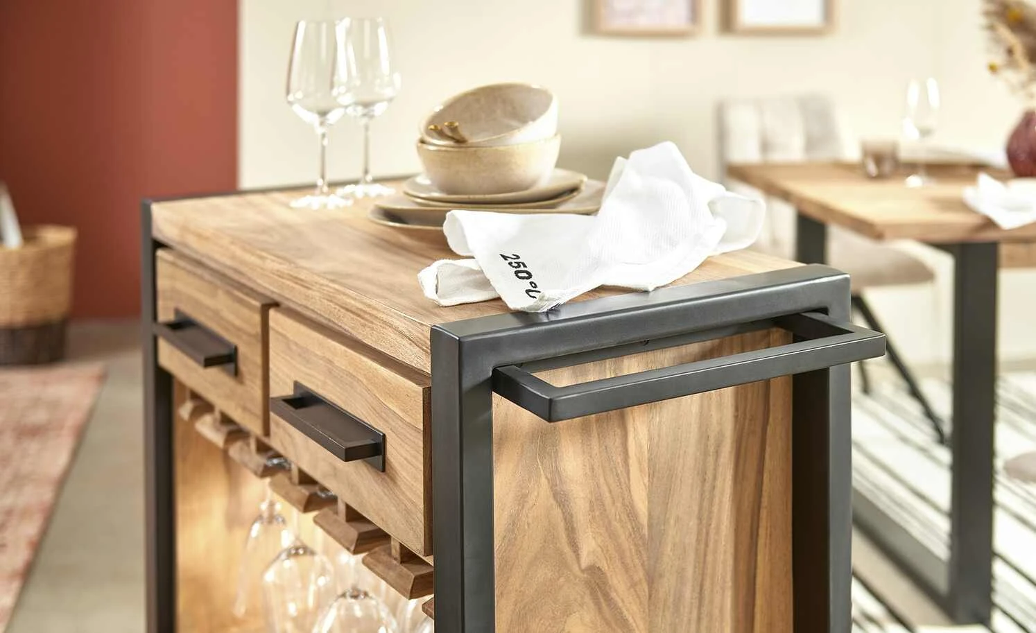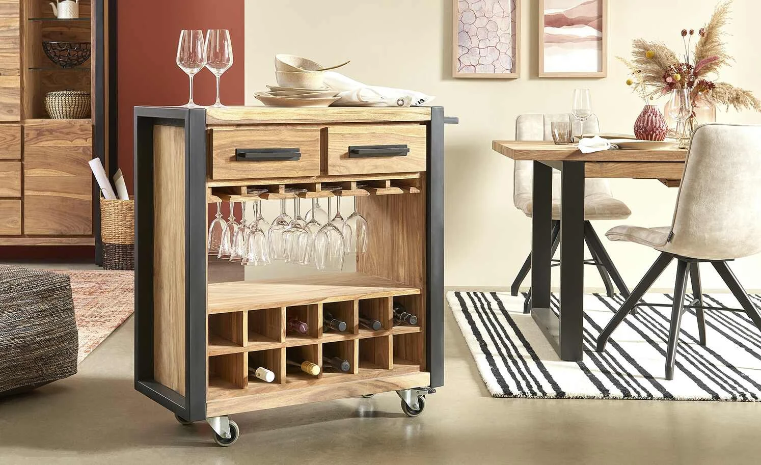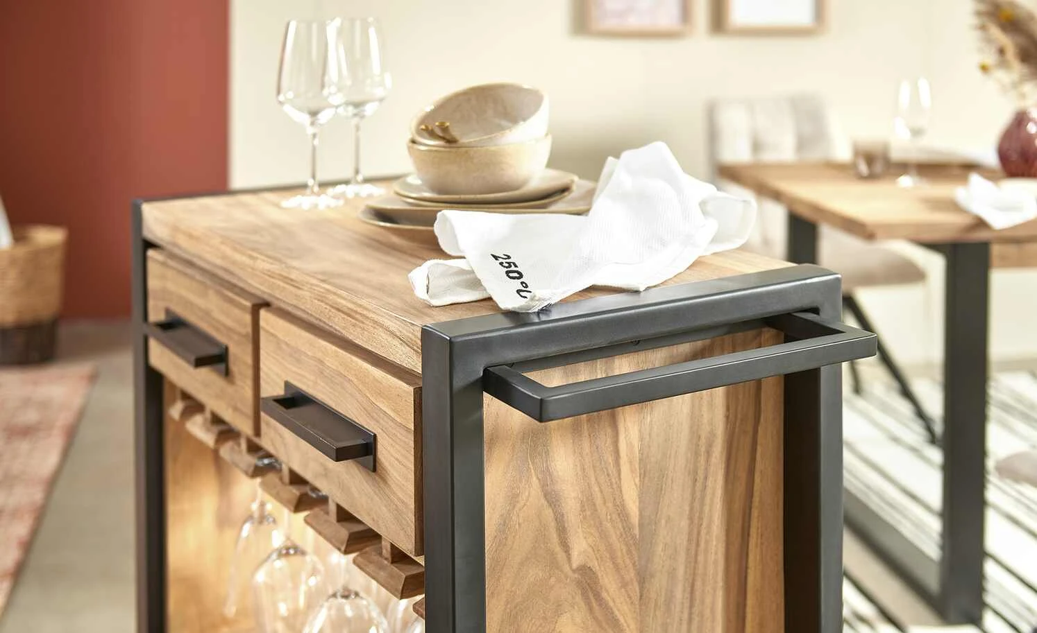 Zum Servieren, Aufbewahren und als Eyecatcher eignet sich der Servierwagen Tierra Fuego One von Gray & Jones. Er hat eine erstklassige Qualität und ist mit Sheeshamholz furniert. Für das Gestell ist stabiles, langlebiges Eisen verwendet worden. Der Wagen ist mit zwei Schubladen und einem großen Fach ausgestattet. Im Flaschenregal können Sie zwölf edle Tropfen oder auch andere Flaschen unterbringen. Die Glashalterung eignet sich für acht Stielgläser. Dank der Rollen ist Tierra Fuego One leicht beweglich. Der Griff kann zeitgleich als Handtuchhalterung verwendet werden.