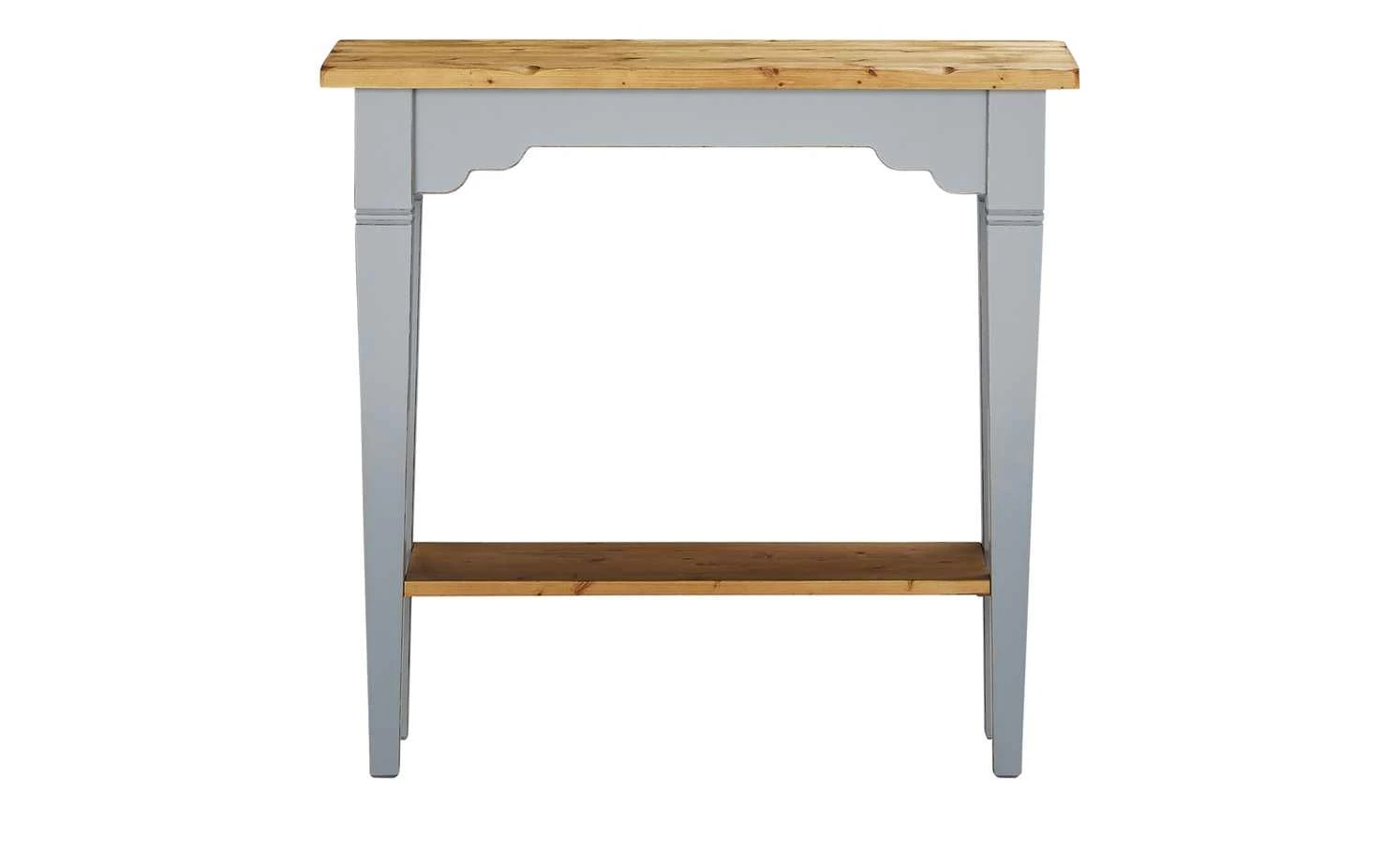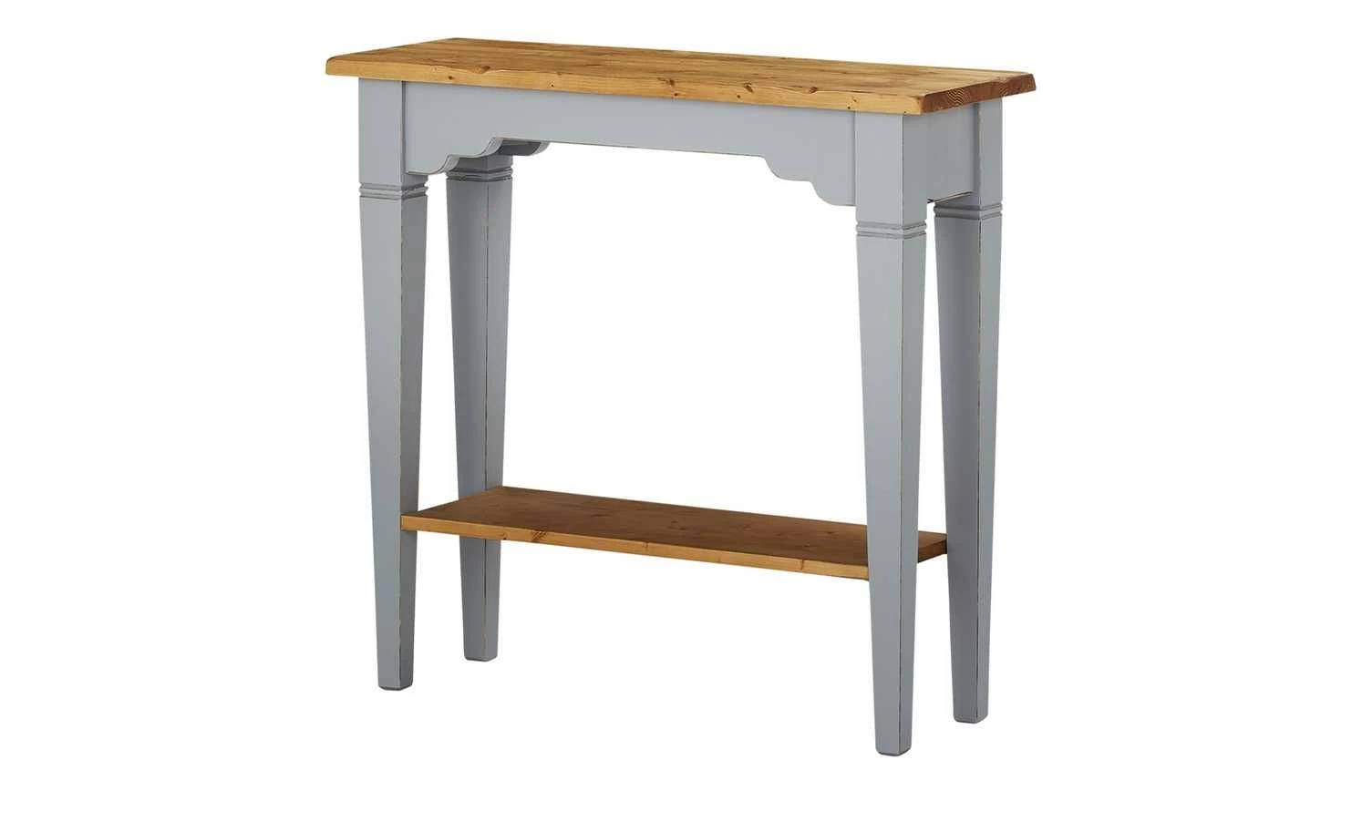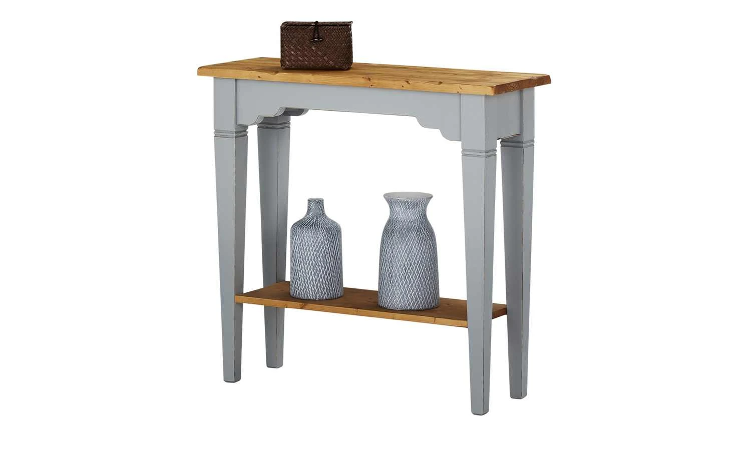 Der Konsolentisch Ilmennau ist ein Highlight für Wohnraum oder Speisezimmer – und macht sich auch im Flur gut. Sie können darauf Pflanzen, eine Lampe und viele dekorative Dinge platzieren. Neben der rechteckigen Tischplatte verfügt Ilmenau auch über eine praktische Ablage im unteren Bereich. Der Tisch ist aus massivem Fichtenholz gefertigt, was ihn stabil und langlebig macht. Tischplatte und Ablage sind im natürlichen Fichtenholzlook gehalten. Das Gestell setzt sich in Antikgrau ab, wobei die gewischte Farbe mit Used-Effekten versehen worden ist. Das passt perfekt zu den Verzierungen im Landhausstil.