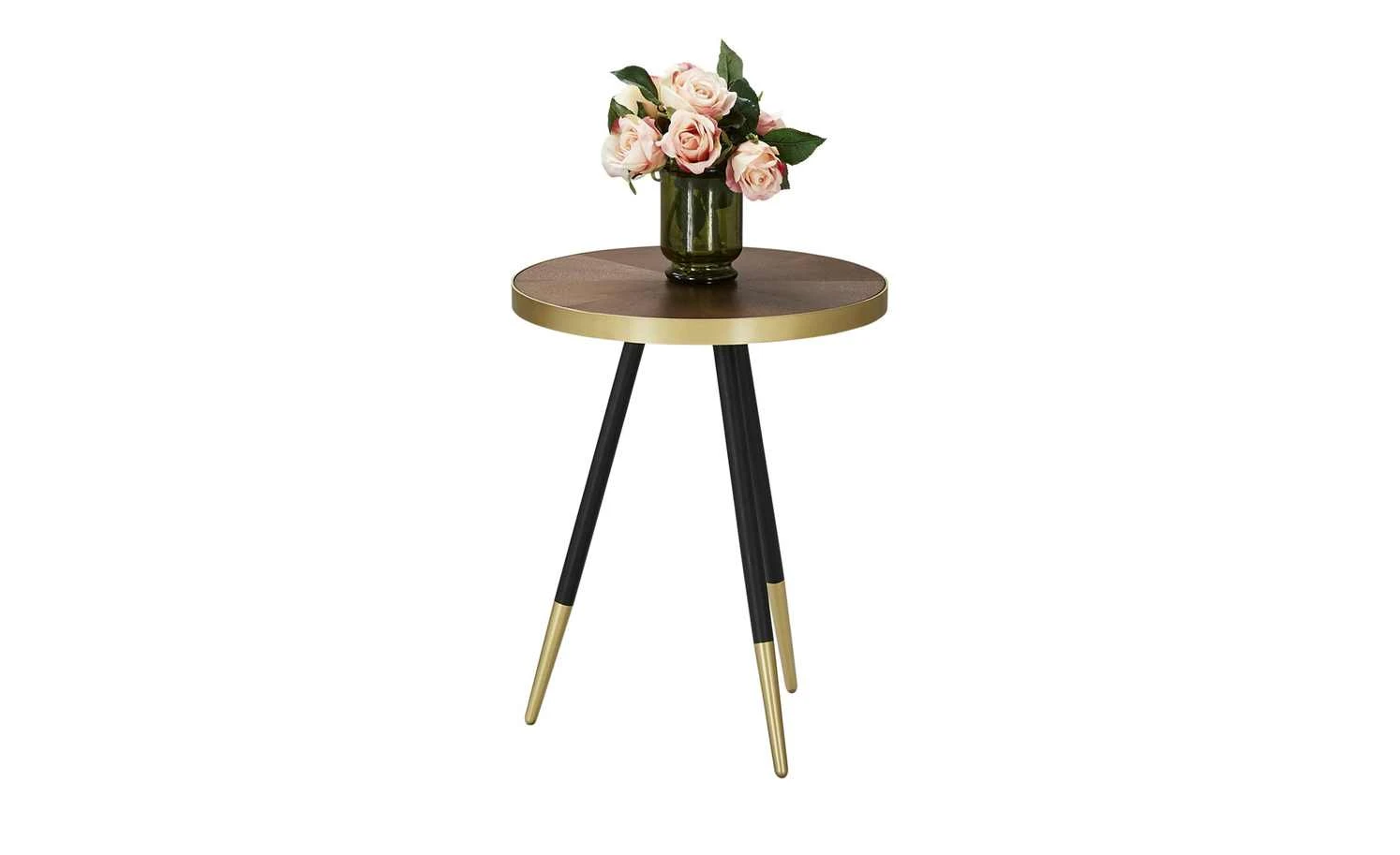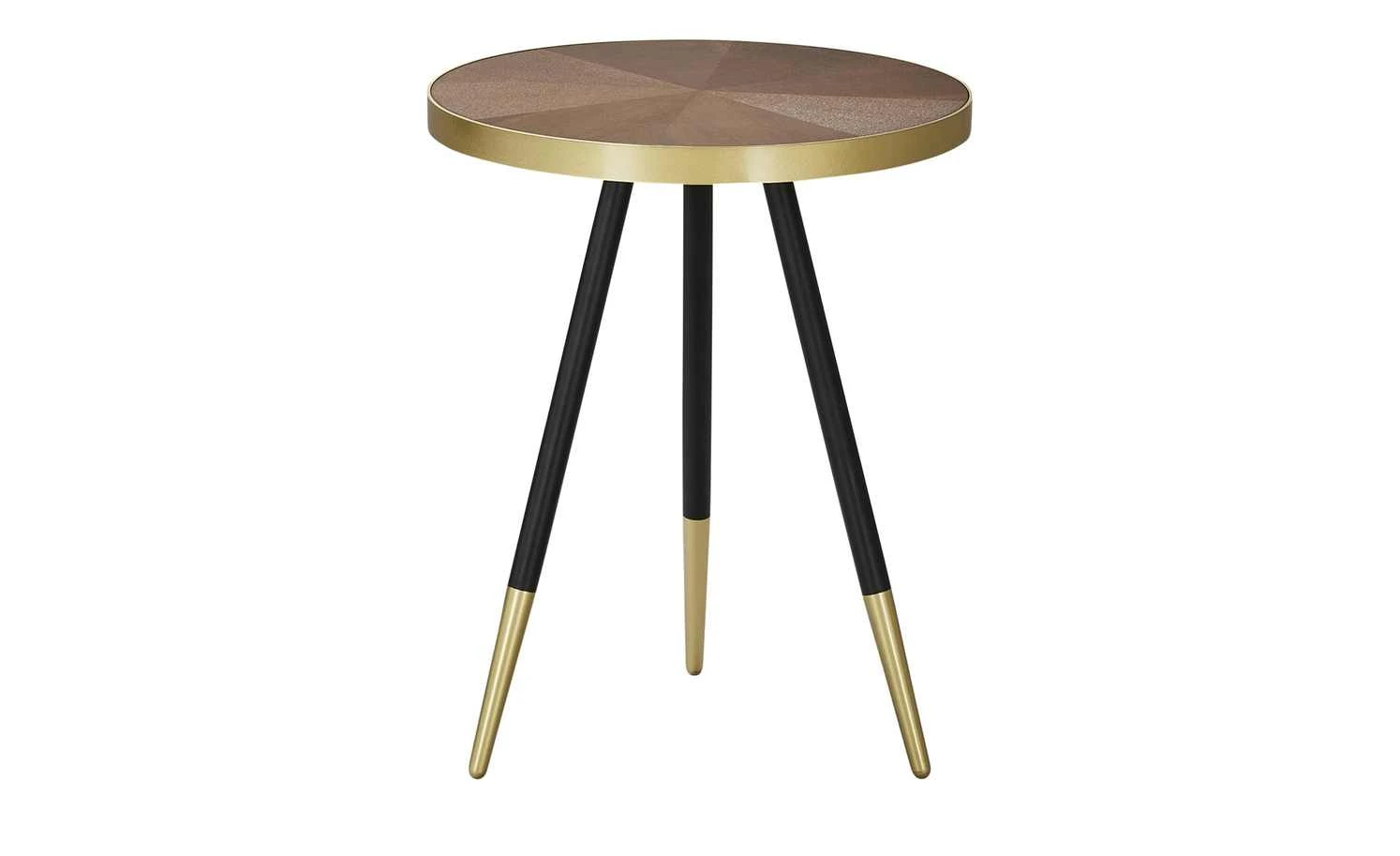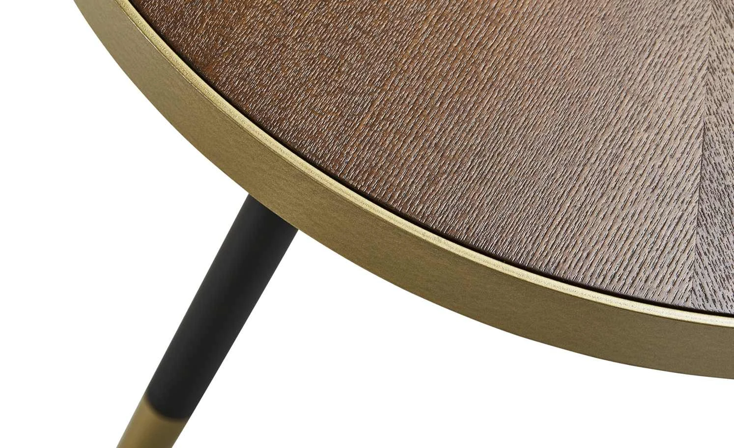 Pianosa ist ein stylischer Design-Couchtisch. Die runde Tischplatte hat einen Durchmesser von 44 Zentimetern und ist mit Eschenholz furniert worden. Das Furnier hat eine attraktive Oberflächenstruktur und ist walnussfarbig lackiert. Als Eyecatcher dient der Metallrand in Goldoptik. Der Look wird an den drei schwarzen Tischbeinen aufgegriffen, die am unteren Ende goldfarbig lackiert worden sind.