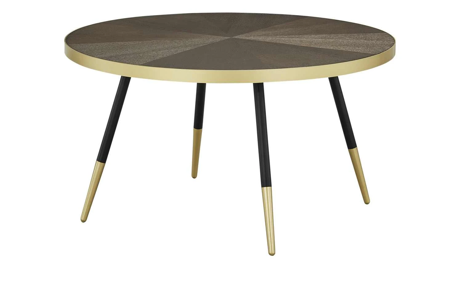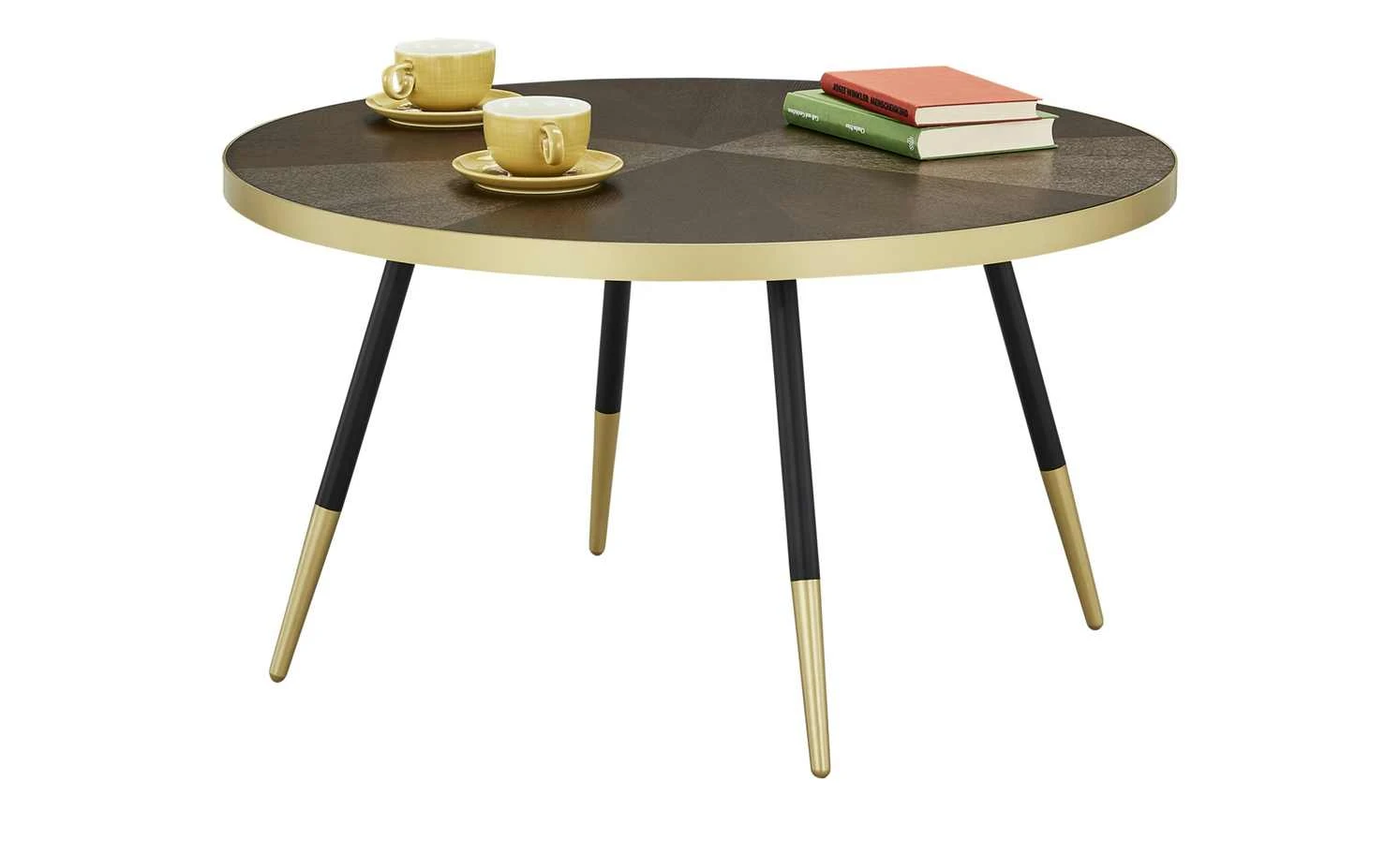 Pianosa ist ein stylischer Design-Couchtisch. Die runde Tischplatte hat einen Durchmesser von 81 Zentimetern und ist mit Eschenholz furniert worden. Das Furnier hat eine attraktive Oberflächenstruktur und ist walnussfarbig lackiert. Als Eyecatcher dient der Metallrand in Goldoptik. Der Look wird an den vier schwarzen Tischbeinen aufgegriffen, die am unteren Ende goldfarbig lackiert worden sind.