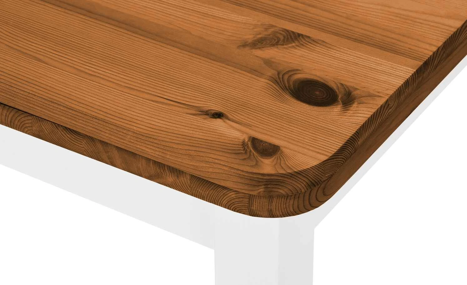 Der Esstisch ist in Kiefer massiv gefertigt. Das Gestell ist weiß lackiert und die Platte laugenfarbig, was den Landhausstil unterstreicht. Aufgrund seiner Größe ist er ideal für kleine Räumlichkeiten. Durch die beiden Ausziehplatten mit jeweils 25 cm, kann die Fläche des Tisches für ca. 6 Personen vergrößert werden.