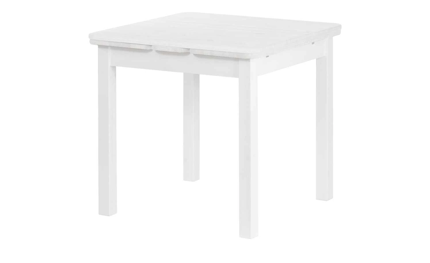 Der Esstisch ist in Kiefer massiv gefertigt. Das Gestell ist weiß lackiert und die Platte laugenfarbig, was den Landhausstil unterstreicht. Aufgrund seiner Größe ist er ideal für kleine Räumlichkeiten. Durch die beiden Ausziehplatten mit jeweils 25 cm, kann die Fläche des Tisches für ca. 6 Personen vergrößert werden.