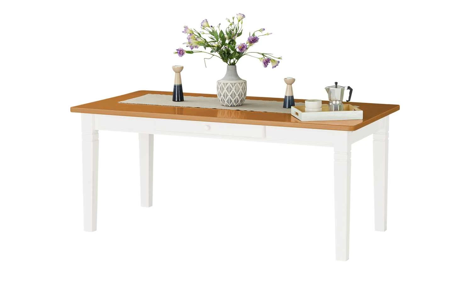 Wenn Sie den Landhausstil gerne mögen, dann ist der Esstisch Florian genau richtig. Der hochwertige Tisch besteht komplett aus massiver Kiefer. Die Holzoberfläche wurde gebeizt und lackiert. Am Gestell des Tisches befinden sich dekorative Ornamente, die Florian sein besonderes Aussehen geben. Entscheiden Sie zwischen einem rustikalen Design Ton in Ton, oder dem kontrastreichen Design mit farblich abgesetzter Tischplatte.