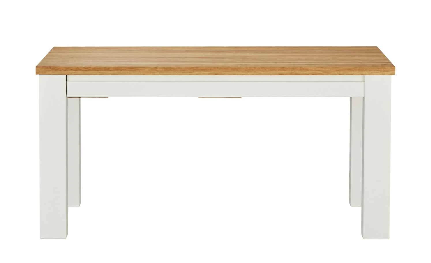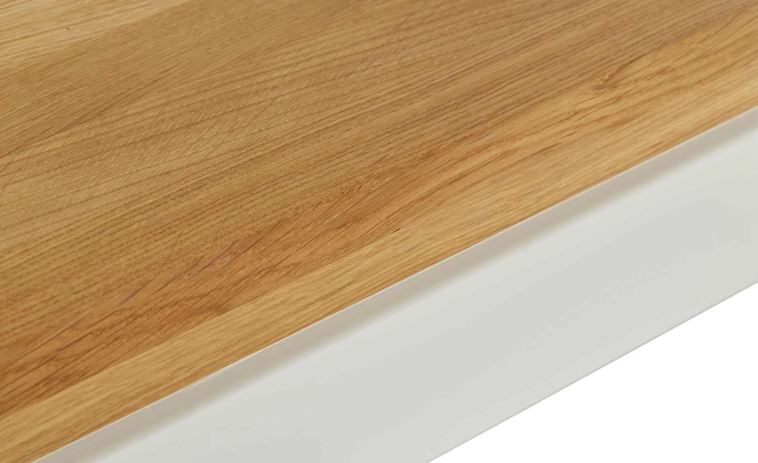 - Mehr zum Material: Gestell und Tischbeine aus Polarkiefer massiv in Reinweiß lackiert, Tischplatte und Verlängerungsplatte aus Wildeiche massiv geölt