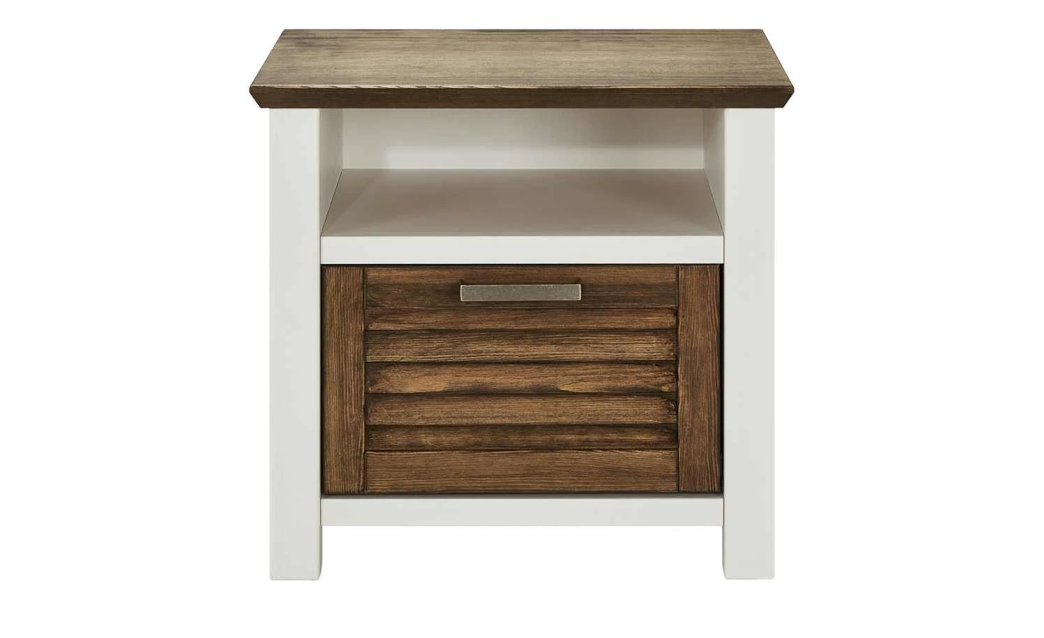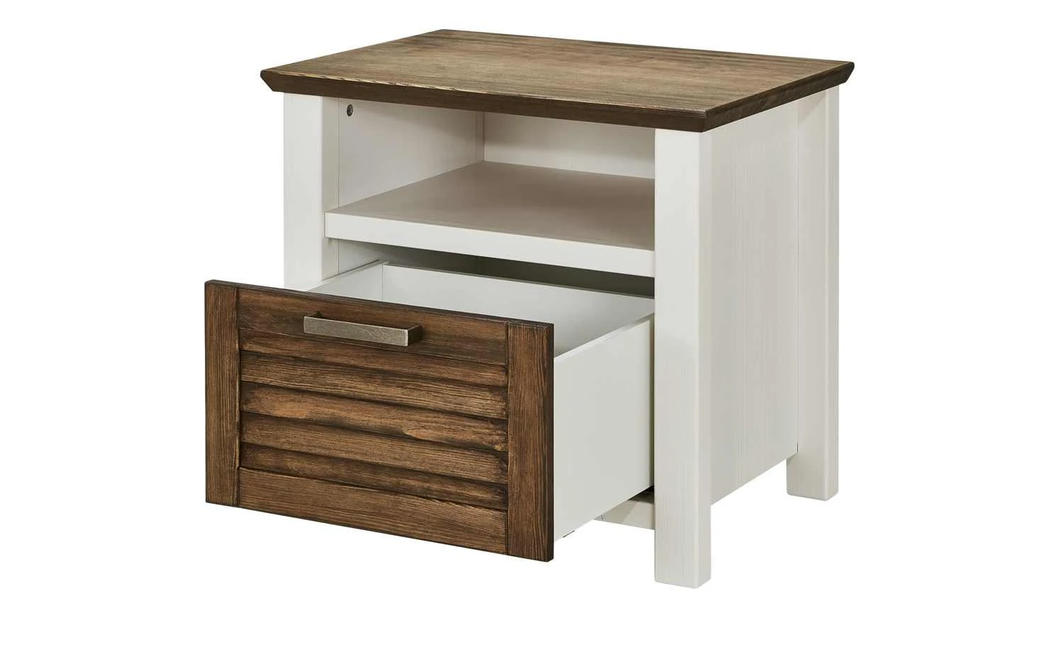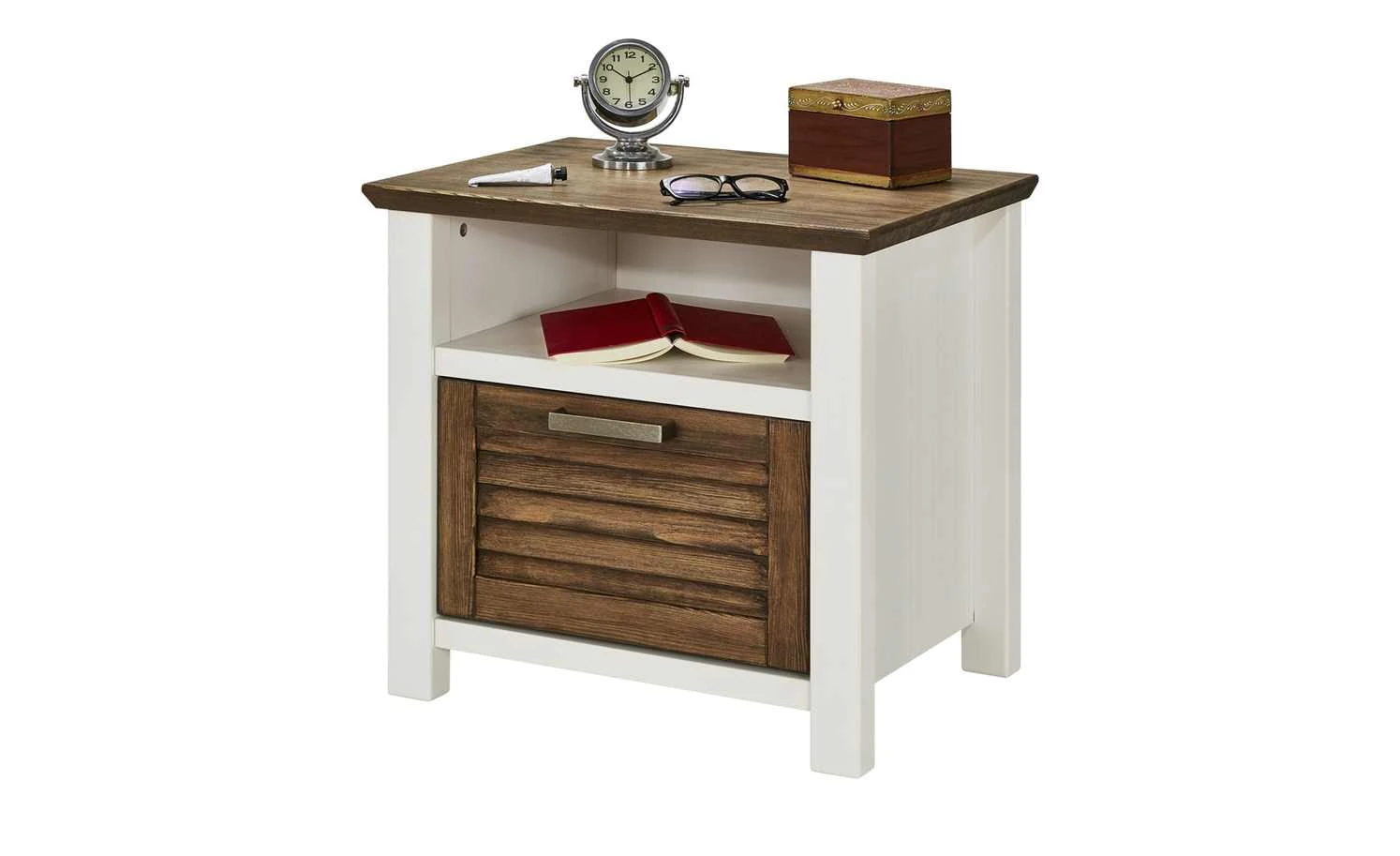 Eine Nachtkommode sollte idealerweise perfekt zum Bett passen. So wie die Nachtkommode Laguna, die mit dem gleichnamigen Bettgestell harmoniert. Sie ist im Landhausstil designt. Die helle und freundliche Pinie Weiß wird von Akzenten in Pinie Terra abgesetzt. Alle hellen Flächen sind furniert und lackiert worden. Die Absetzungen in Terra bestehen aus massiver Pinie und sind gewischt, gebeizt und lackiert. Laguna verfügt über ein offenes Fach und eine Schublade in Lamellenoptik.