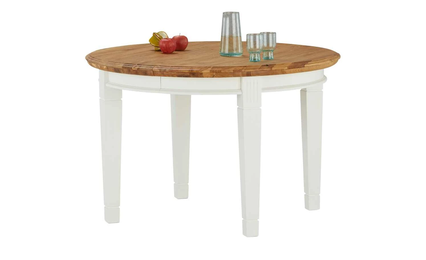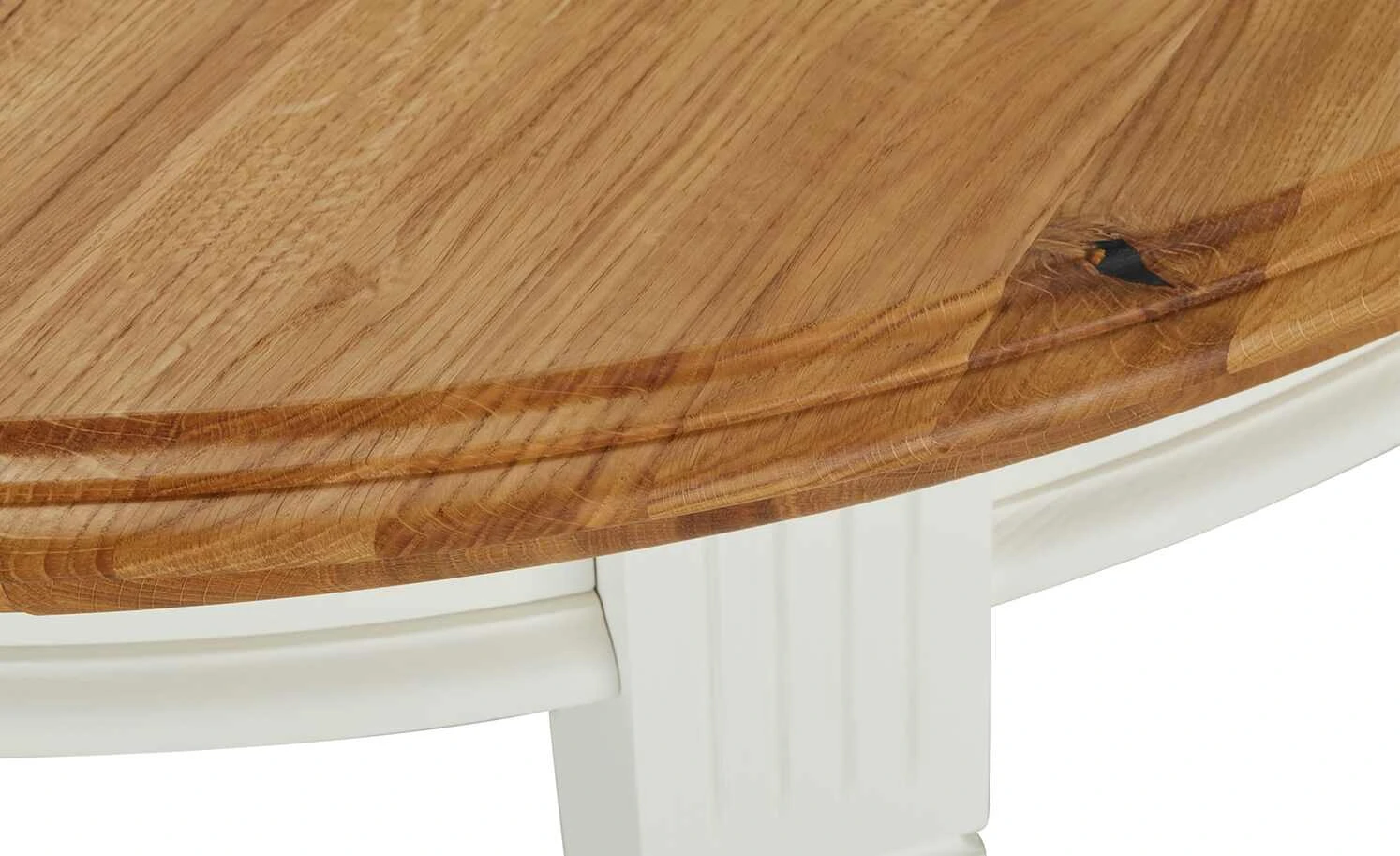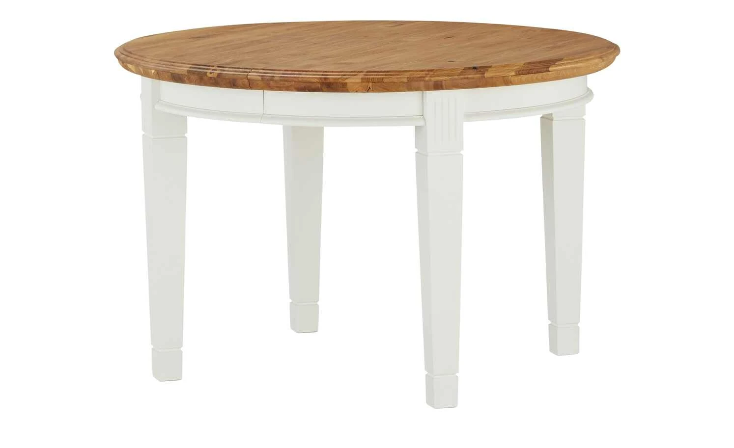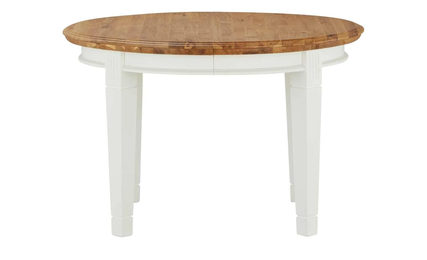 - Mehr zum Material: Tischplatte und Erweiterungsplatte aus Wildeiche natur massiv geölt, Tischgestell und Tischbeine aus Polarkiefer massiv in Reinweiß lackiert