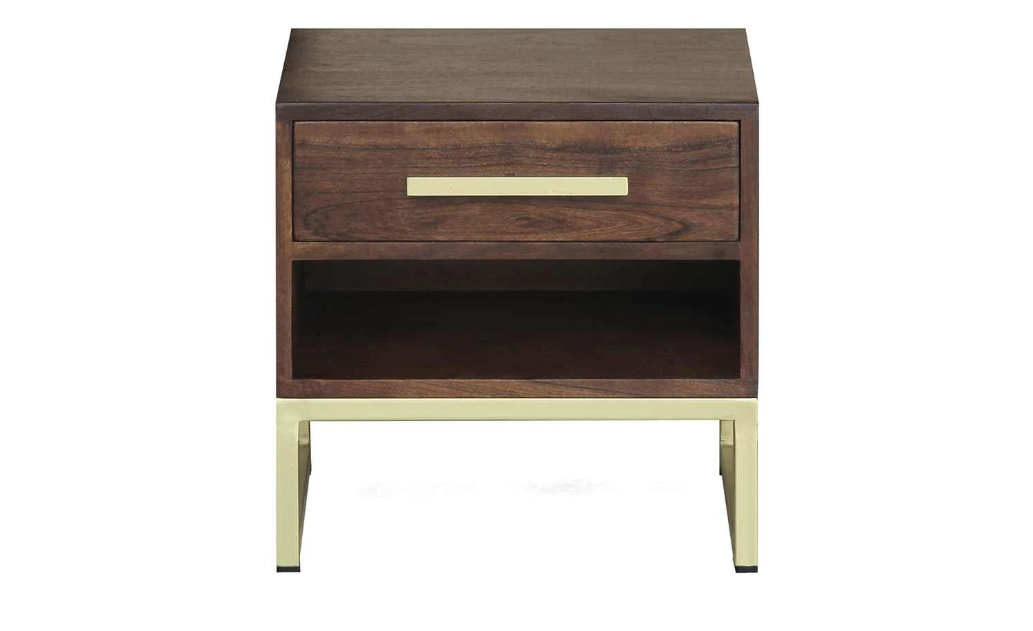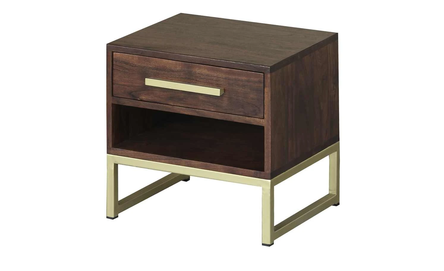 Die kleine, elegante Nachtkommode Calatria besteht aus wunderschön dunklem Akazienholz. Ein goldfarbenes Gestell trägt den Nachttisch und bildet zusammen mit dem Griff einen tollen Kontrast zum gemaserten Massivholz. Kleinigkeiten finden im praktischen Schubfach Platz. Die Abendlektüre können Sie problemlos in dem offenen Fach darunter ablegen.
