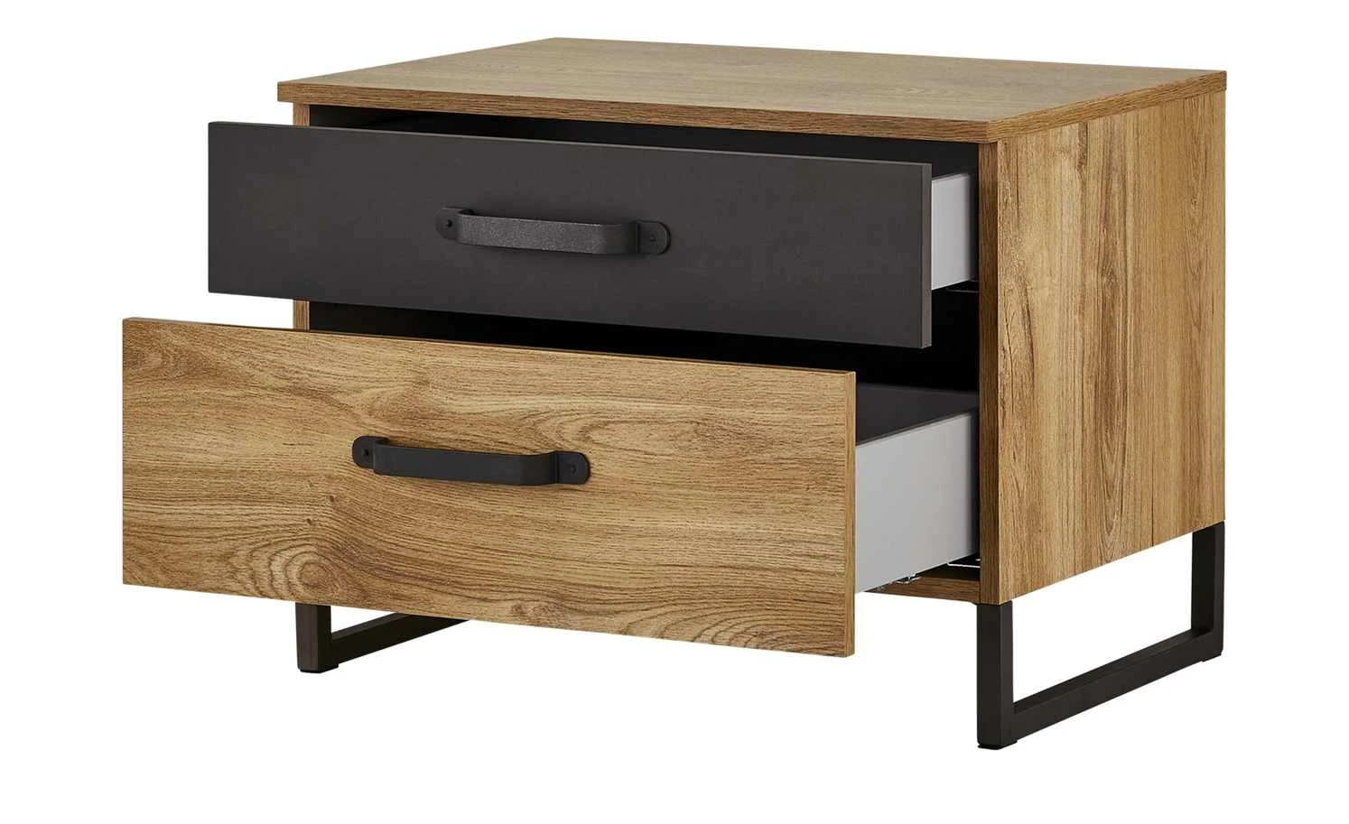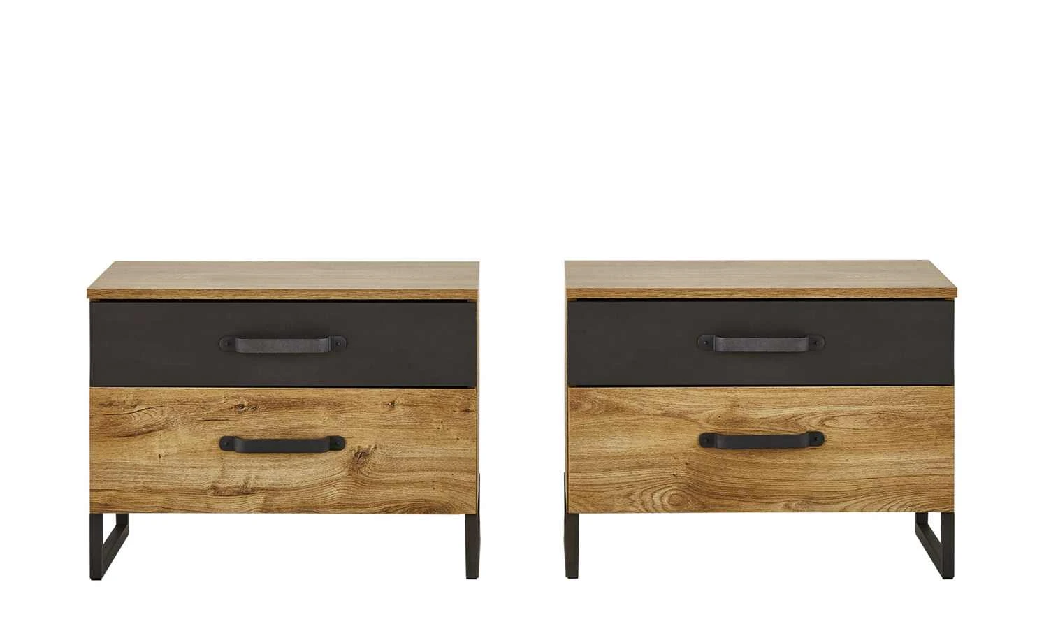 Mit den Nachtkommoden Durham können Sie das gleichnamige Doppelbett wunderbar ergänzen. Gleich zwei Kommoden sind im Lieferumfang enthalten, so dass eine links und die andere rechts vom Bett stehen kann. Auch optisch passen die Kommoden perfekt zur gleichnamigen Serie. Das Dekor in Plankeneiche (Nachbildung) wird durch eine dunkle Absetzung in Stahl (Nachbildung) kontrastiert. Passend dazu sind Kufengestell und Bügelgriffe aus schwarzem Metall. Durham ist mit jeweils zwei Schubladen ausgestattet.