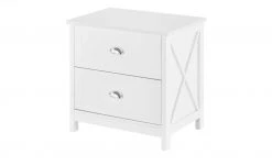 Mosi ist eine hübsche, kleine Nachtkonsole im Landhauslook. Sie passt perfekt zu den anderen Möbeln der Serie. Ein Eyecatcher sind die X-förmigen Streben an der Seite. Mosi verfügt über zwei Schubladen. Die Griffe sind aus Metall und haben eine typische Apotheker-Optik.