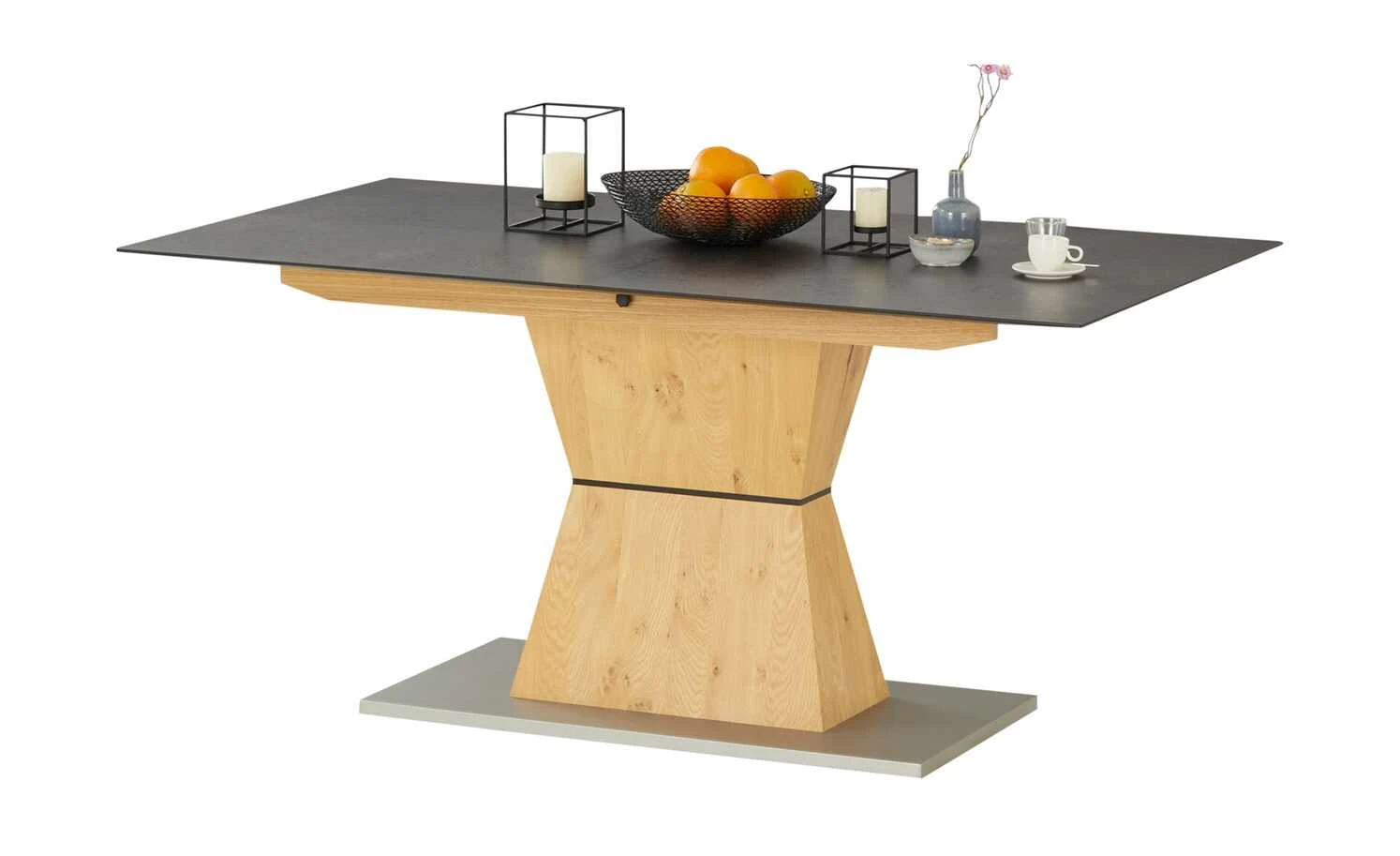- Mehr zum Material: Bodenplatte lackiert in Edelstahl-Optik, Gestell: Charakter-Eiche furniert, Tischplatte aus HPL (High Pressure Laminate) in Granit-Design