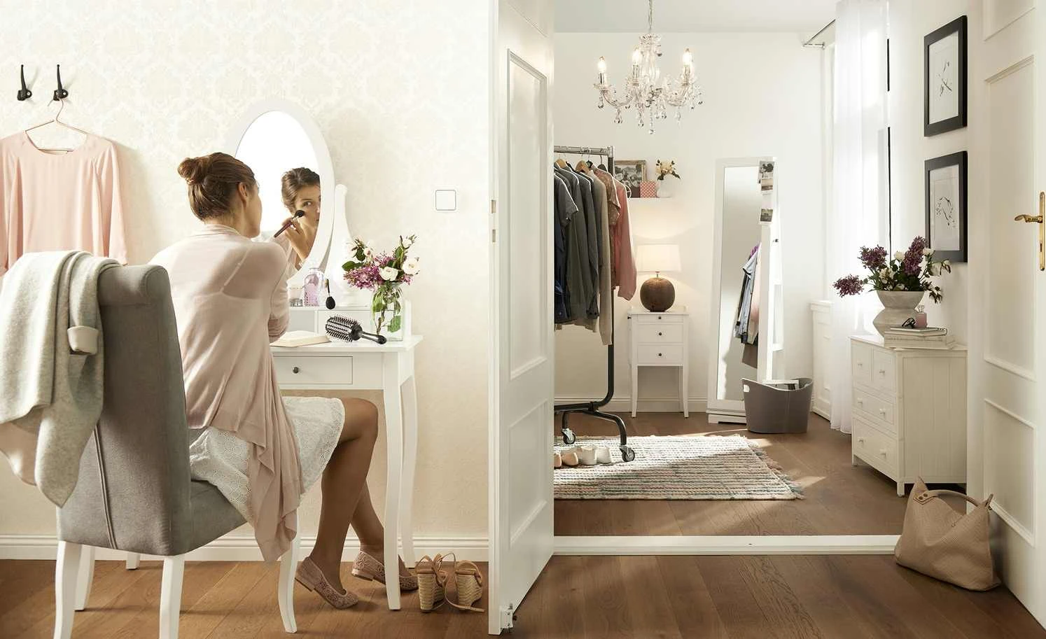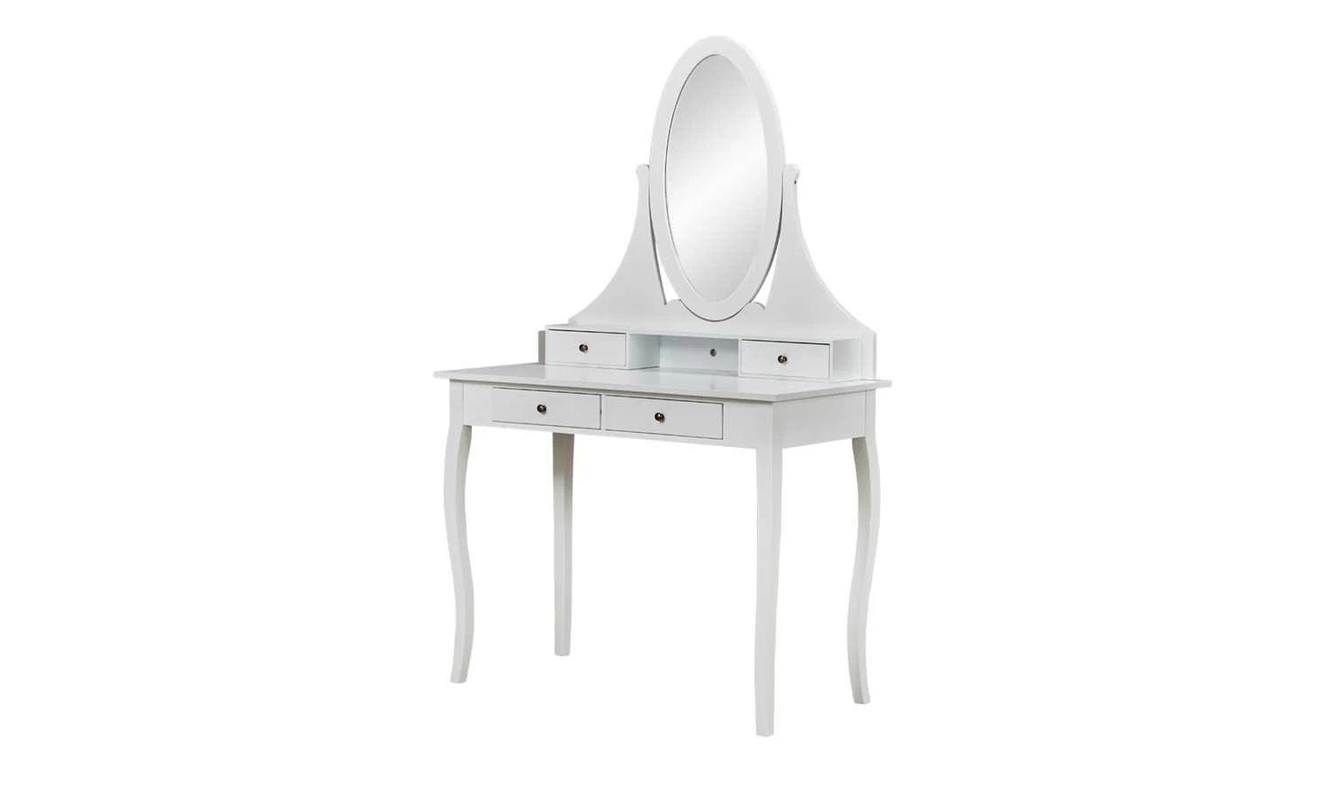 Zum alltäglichen Schminken und Frisieren ist der Schminktisch Mosi einfach ideal. Gleichzeitig bringt er einen romantisch-verspielten, glamourösen Look in das Schlafzimmer. Mosi ist komplett weiß lackiert. Der große mittige Spiegel lässt sich drehen, so dass Sie ihn beim Stylen auf sich ausrichten können. Mosi ist mit drei geräumigen Schubfächern ausgestattet. Auf der rechten Seite finden Sie außerdem eine Schublade für Kosmetiktücher. In der Abdeckplatte befindet sich genau darüber eine Öffnung, aus der Sie die Tücher einfach herausziehen können.