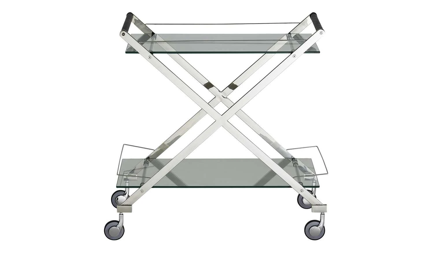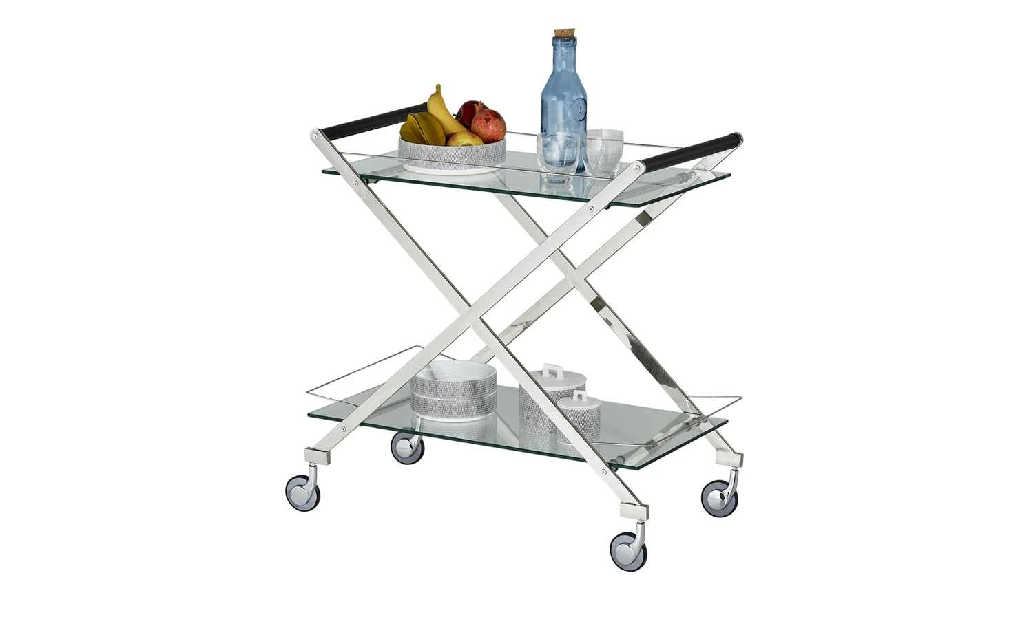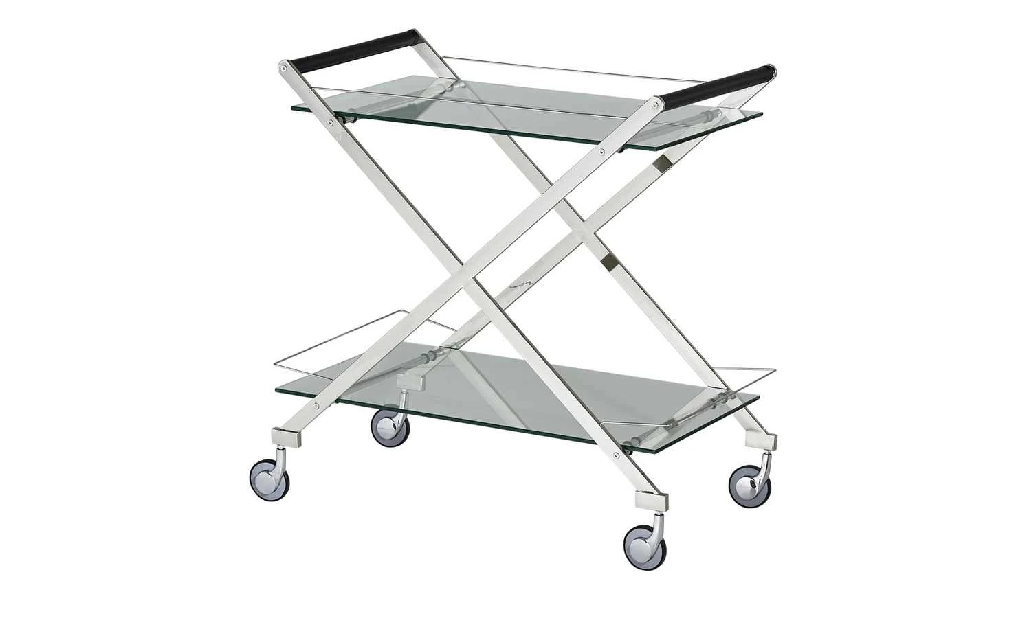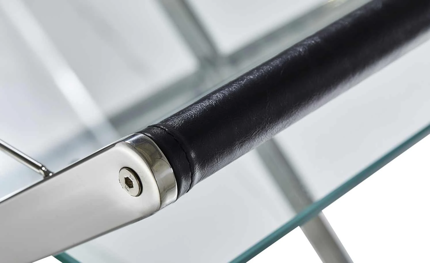 - Mehr zum Material: Rollen aus Kunststoff, Griffe aus Metall mit Kunstleder Ummantelung (100% Polyurethan) in Schwarz, Tisch-/ und Ablageplatte aus Klarglas (Sicherheitsglas)