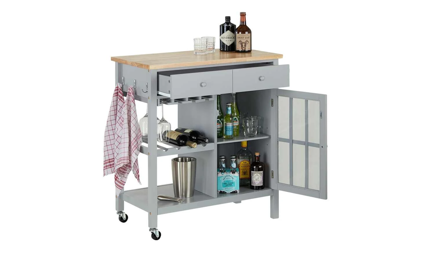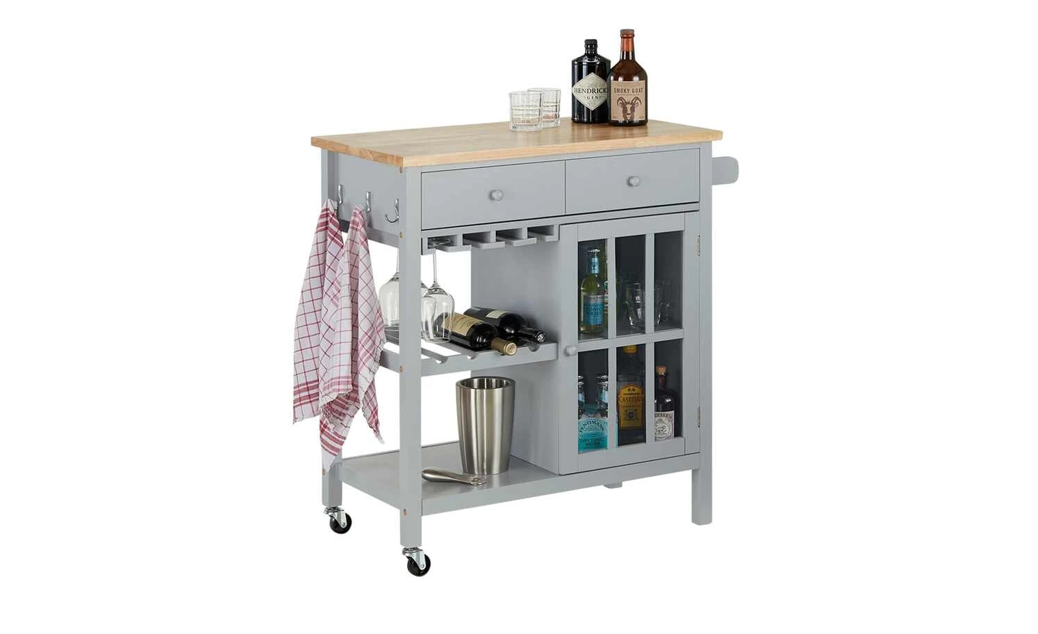 - Lieferumfang / mitgeliefertes Zubehör: 3 Haken, Flaschenregal für 4 Flaschen, Glashalter, Handtuchhalter