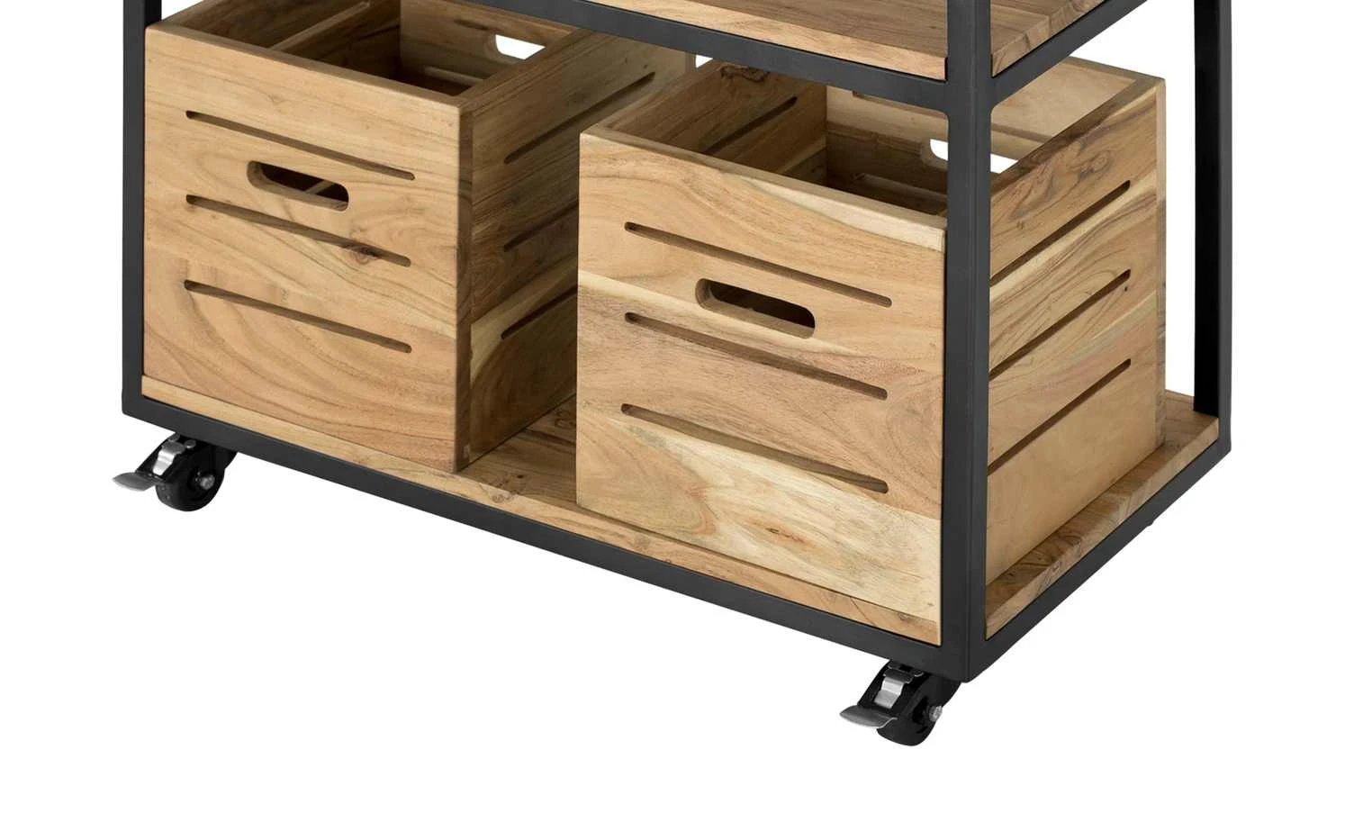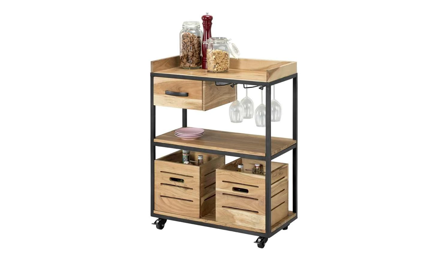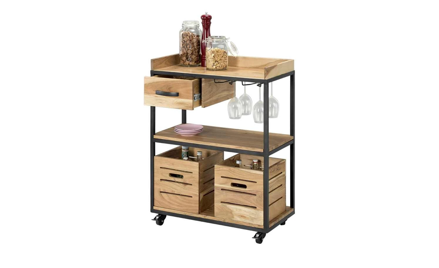 Der 94 cm hohe Servierwagen Muli hat ein durchdachtes Design und fällt durch seinen Materialmix sofort ins Auge. Das Gestell besteht aus schwarz lackiertem Metall. Dies steht im optischen Kontrast zu dem natürlichen Akazienholz. Auf drei Ebenen können Gegenstände, die in der Küche unerlässlich sind, platziert werden. Neben einer Schublade und zwei vielseitig einsetzbaren Mehrzweckboxen mit Griff gibt es noch zwei praktische Metallhalter. Hier lassen sich Gläser hängend befestigen, was noch mehr Stauraum schafft. Auf seinen Rollen befördern Sie den Servierwagen spielend leicht durch den Raum. Machen Sie sich das Leben damit einfacher – ein Eyecatcher ist der Servierwagen sowieso.