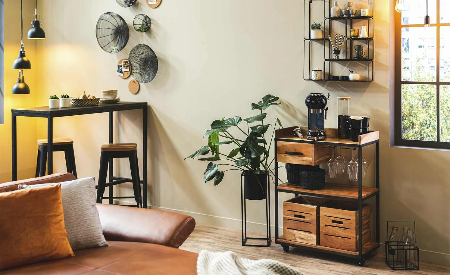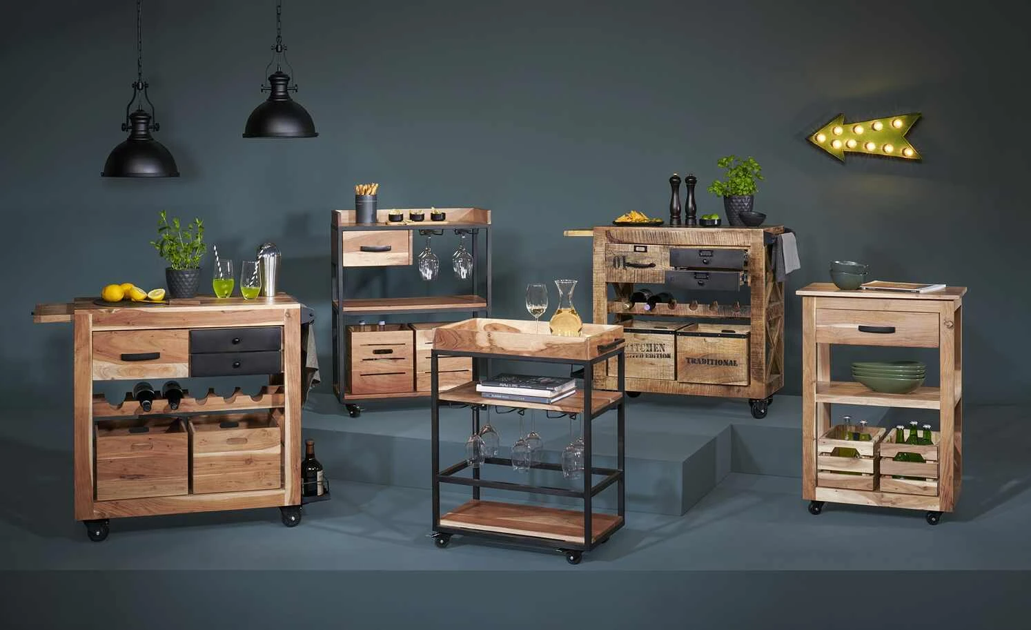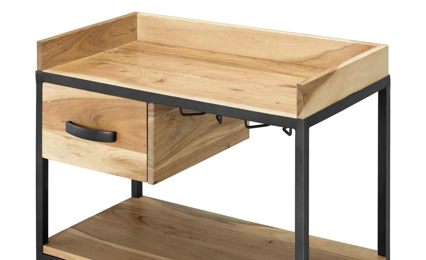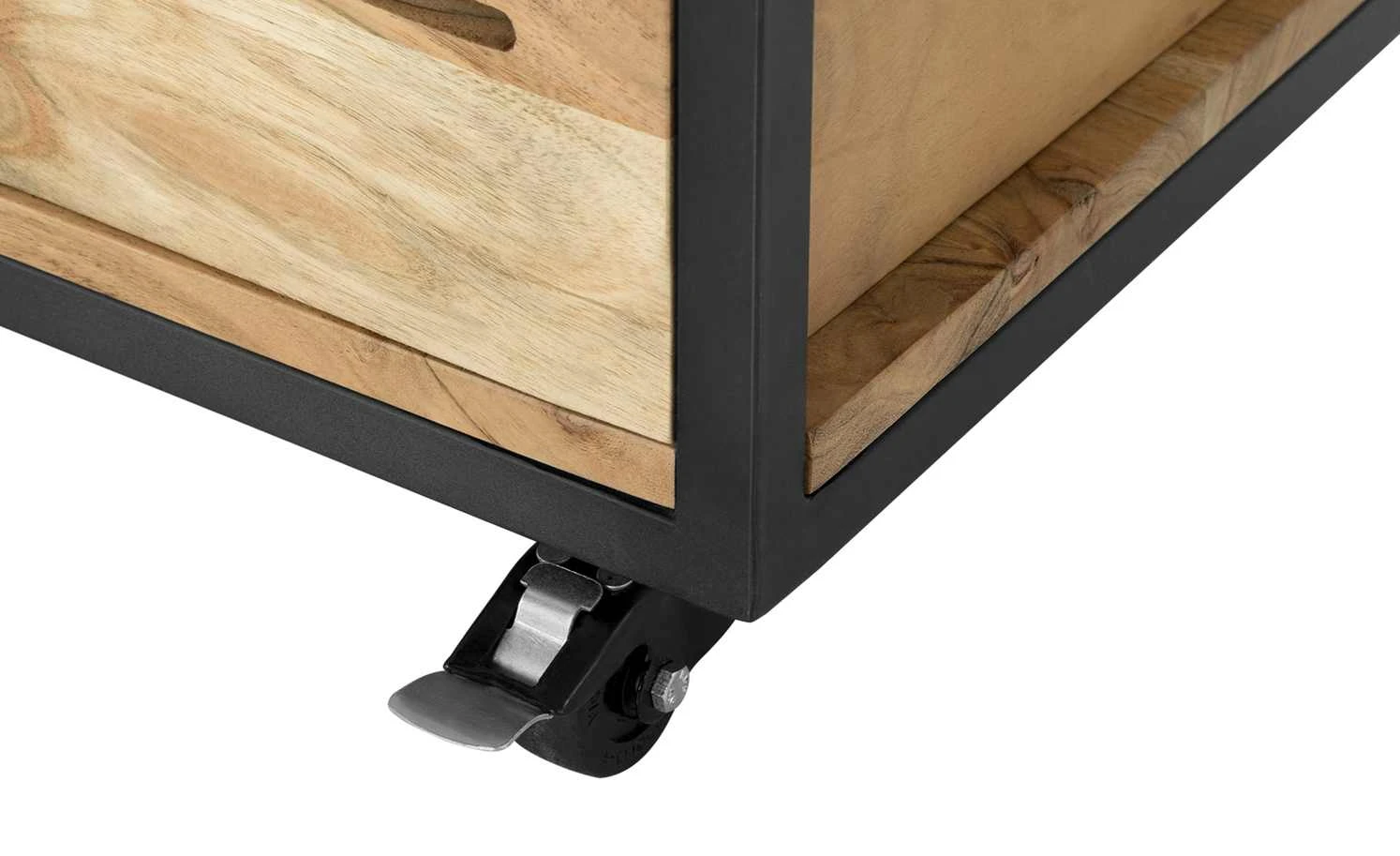Der 94 cm hohe Servierwagen Muli hat ein durchdachtes Design und fällt durch seinen Materialmix sofort ins Auge. Das Gestell besteht aus schwarz lackiertem Metall. Dies steht im optischen Kontrast zu dem natürlichen Akazienholz. Auf drei Ebenen können Gegenstände, die in der Küche unerlässlich sind, platziert werden. Neben einer Schublade und zwei vielseitig einsetzbaren Mehrzweckboxen mit Griff gibt es noch zwei praktische Metallhalter. Hier lassen sich Gläser hängend befestigen, was noch mehr Stauraum schafft. Auf seinen Rollen befördern Sie den Servierwagen spielend leicht durch den Raum. Machen Sie sich das Leben damit einfacher – ein Eyecatcher ist der Servierwagen sowieso.