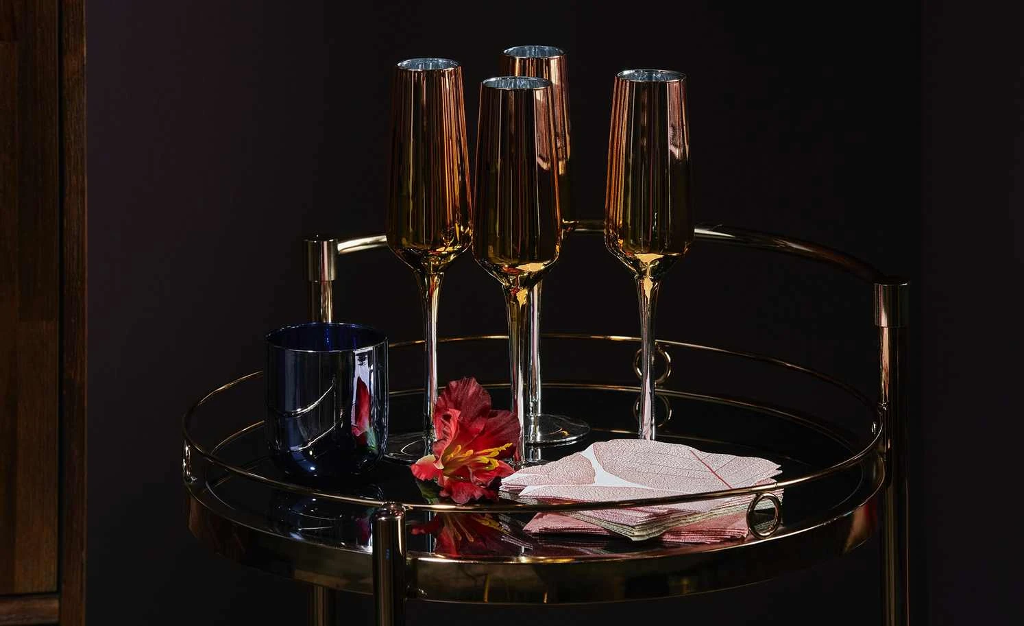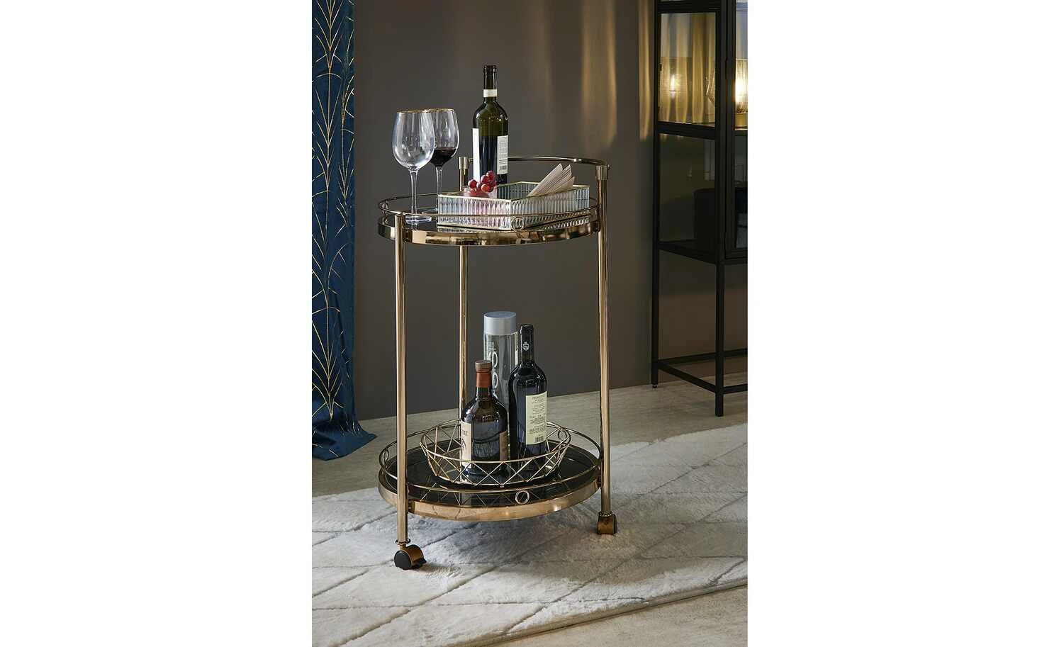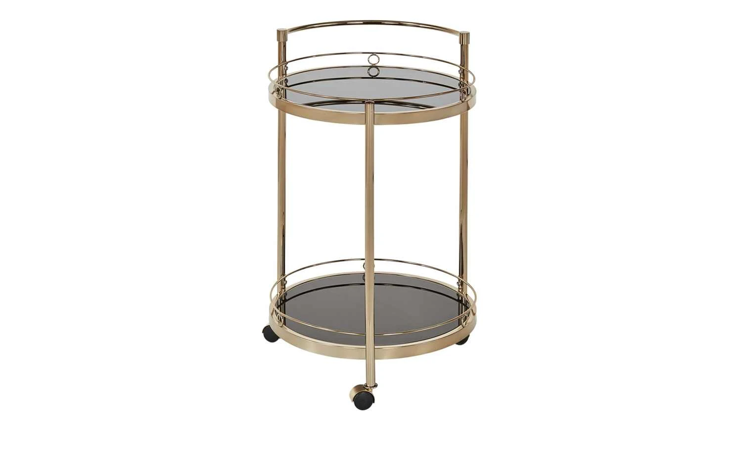 Den Servierwagen Oro können Sie zum Servieren, aber auch als Beistelltisch nutzen. Durch die drei Rollen lässt er sich leicht an den gewünschten Ort bewegen. Die beiden Ablagen haben einen Schutzrand, damit alles, was auf ihnen steht, auch wirklich sicher steht. Die Ablagen sind aus schwarzem Glas. Für das Gestell ist Metall verwendet worden. Es hat eine goldfarbene, galvanisierte Oberfläche.