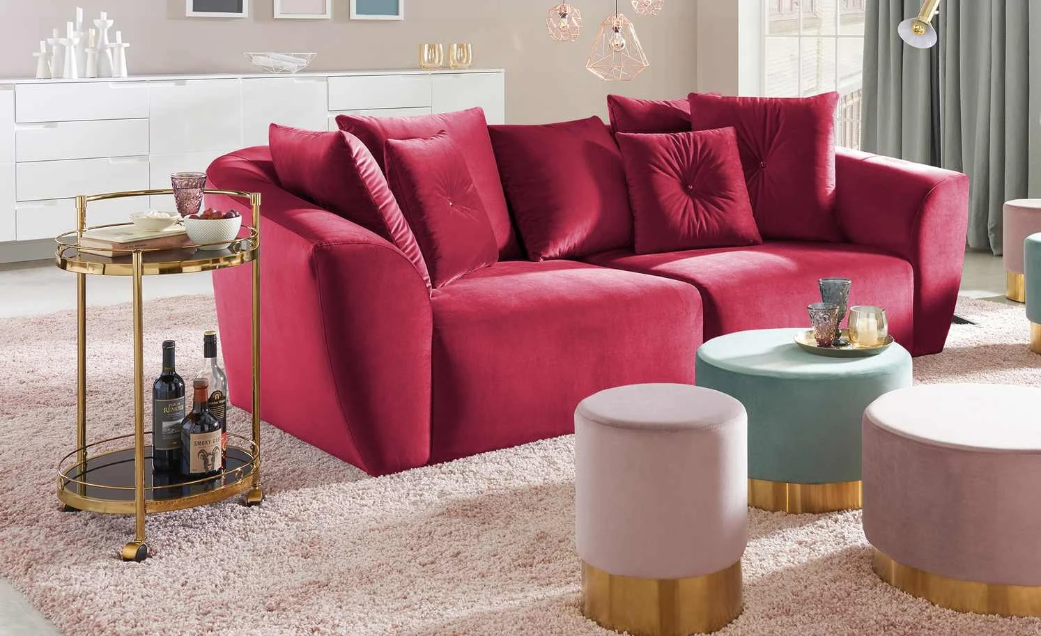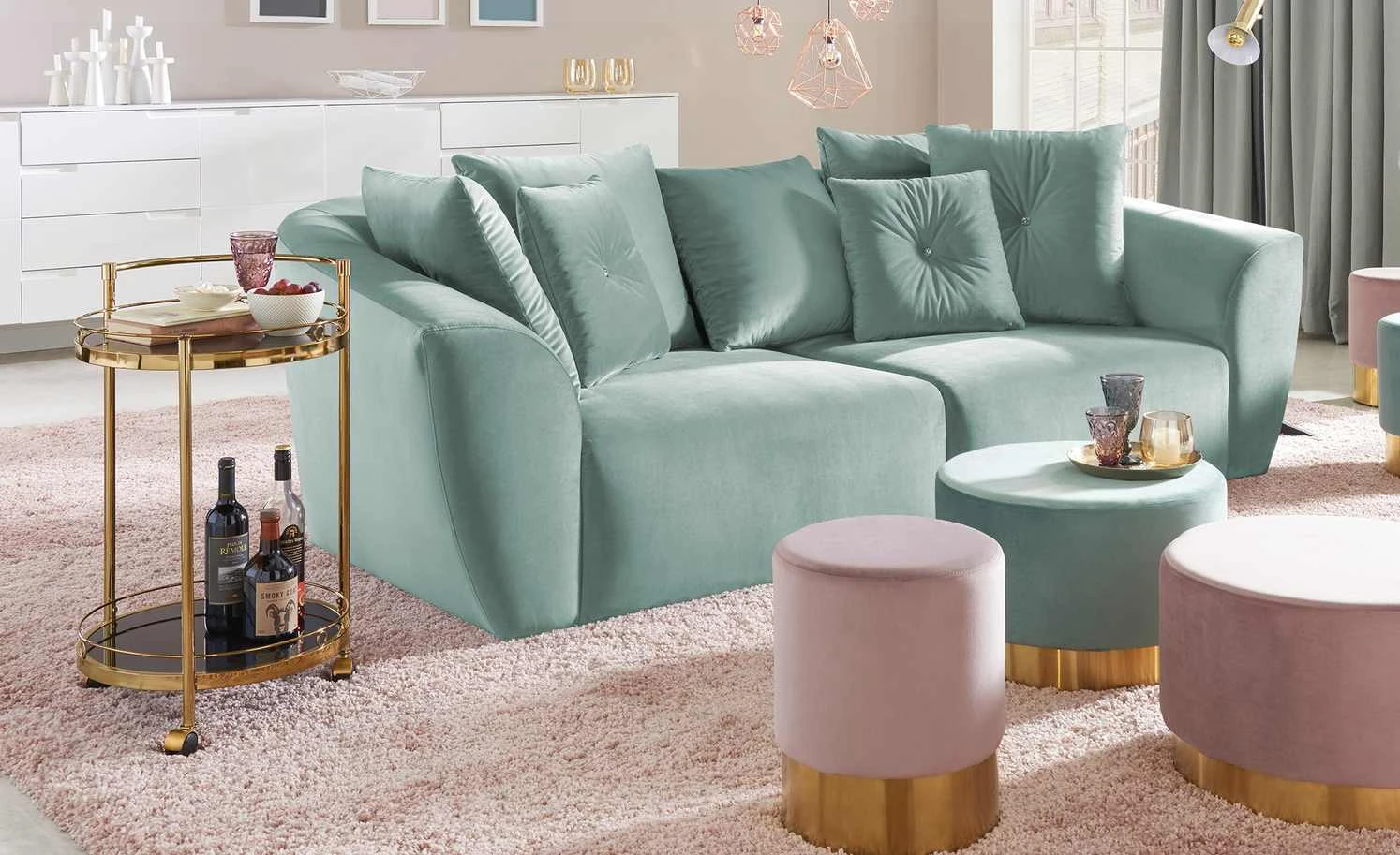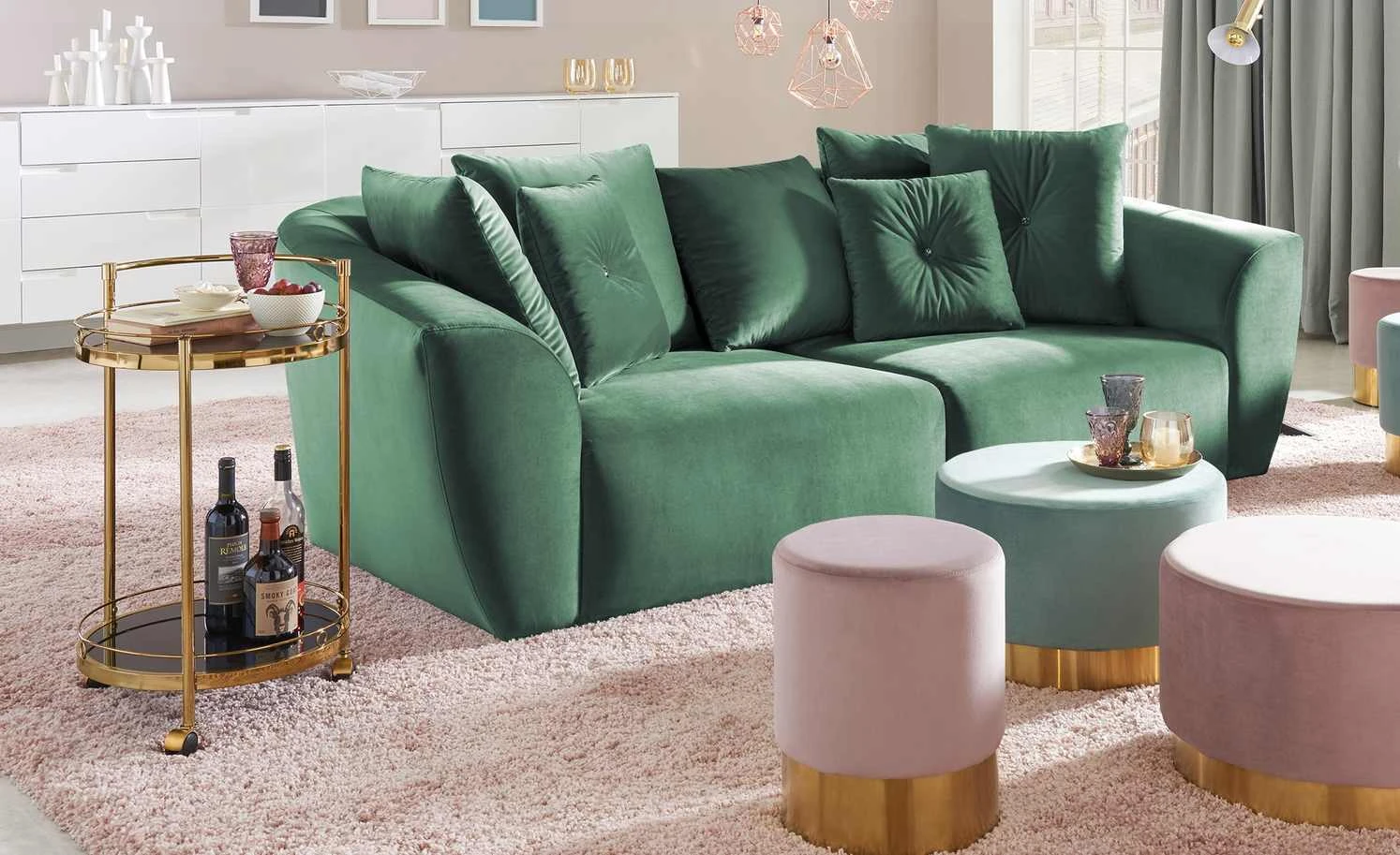 Den Servierwagen Oro können Sie zum Servieren, aber auch als Beistelltisch nutzen. Durch die drei Rollen lässt er sich leicht an den gewünschten Ort bewegen. Die beiden Ablagen haben einen Schutzrand, damit alles, was auf ihnen steht, auch wirklich sicher steht. Die Ablagen sind aus schwarzem Glas. Für das Gestell ist Metall verwendet worden. Es hat eine goldfarbene, galvanisierte Oberfläche.