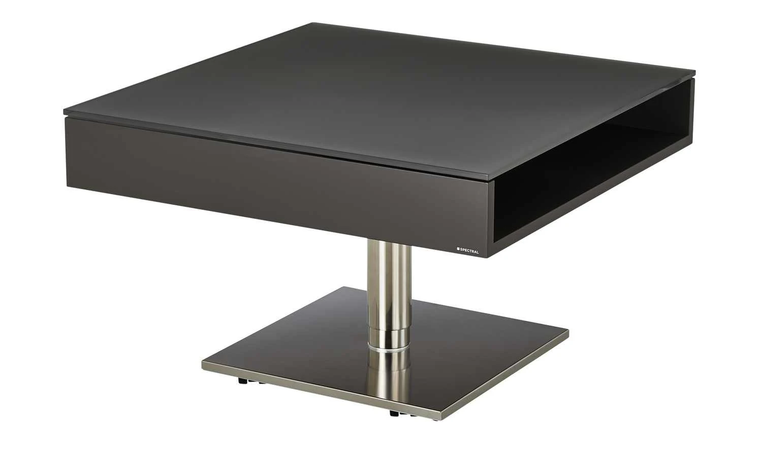Der Couchtisch Tables überzeugt mit Design, Qualität und Funktionalität. Er ist von der Marke SPECTRAL, trägt das Siegel Made in Germany und besteht aus besten Materialien. Dazu gehören Glas, Aluminium und Edelstahl. Die Tischplatte ist aus satiniertem Glas gefertigt. Das Säulengestell aus galvanisiertem Aluminium lässt sich in der Höhe variieren – und zwar von 45 bis 62 cm. Unterhalb der Bodenplatte befinden sich Rollen, durch die Sie den Tisch leicht bewegen können. Ein offenes Fach unterhalb der Tischplatte bietet zusätzlichen Stauraum.