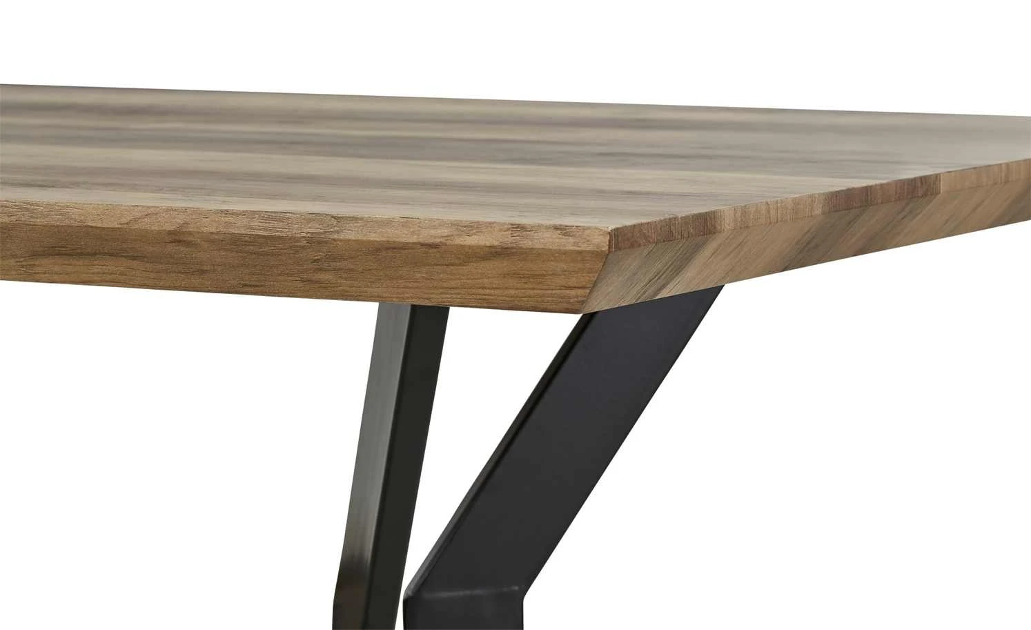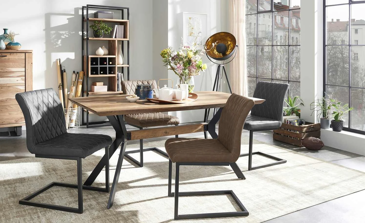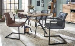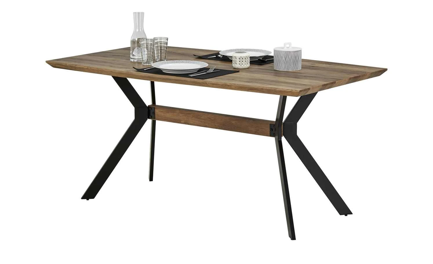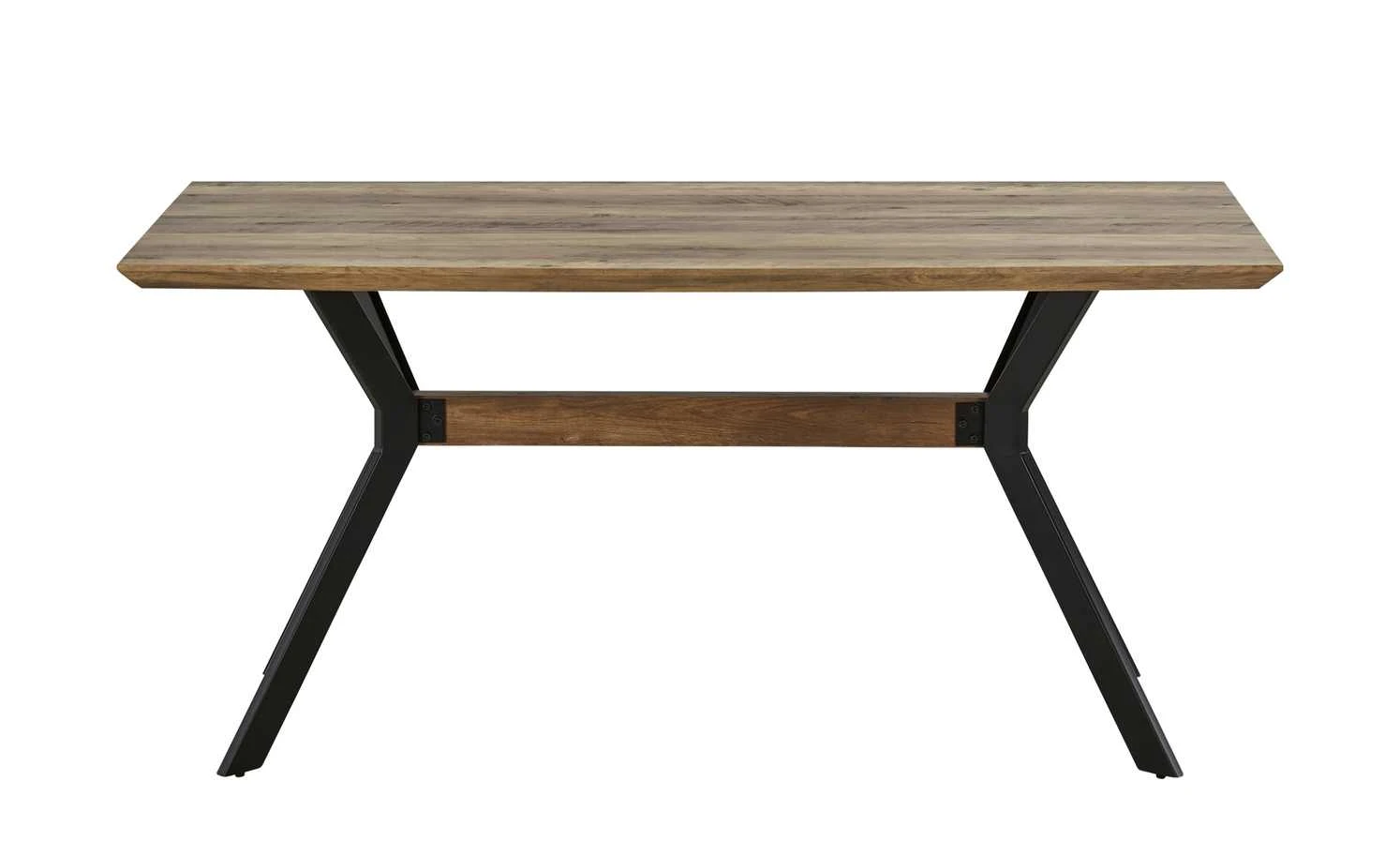 Der Esstisch Lino fällt durch sein dekoratives Design-Gestell auf. Die X-förmigen Tischbeine aus Metall werden von einer Querstrebe verbunden. Sie greift das Dekor der Tischplatte auf. Die Wildeiche (Nachbildung) hat eine ausgeprägte Holzstruktur und sieht dabei sehr echt aus. Lino ist 160 x 90 Zentimeter groß und bietet Platz für etwa sechs Personen.