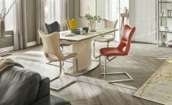 Den Esstisch Torres von uno können Sie auf bis zu 250 Zentimeter ausziehen. Der Kopfauszug macht es möglich. Im verlängerten Zustand bietet Torres Platz für bis zu zehn Personen. Die Tischplatte aus lackiertem Glas ruht auf einem Gestell in Säulenform. Der cappuccinobeige Farbton wird durch die Bodenplatte in Edelstahl abgesetzt. Sie hat ein edles, gebürstetes Finish.