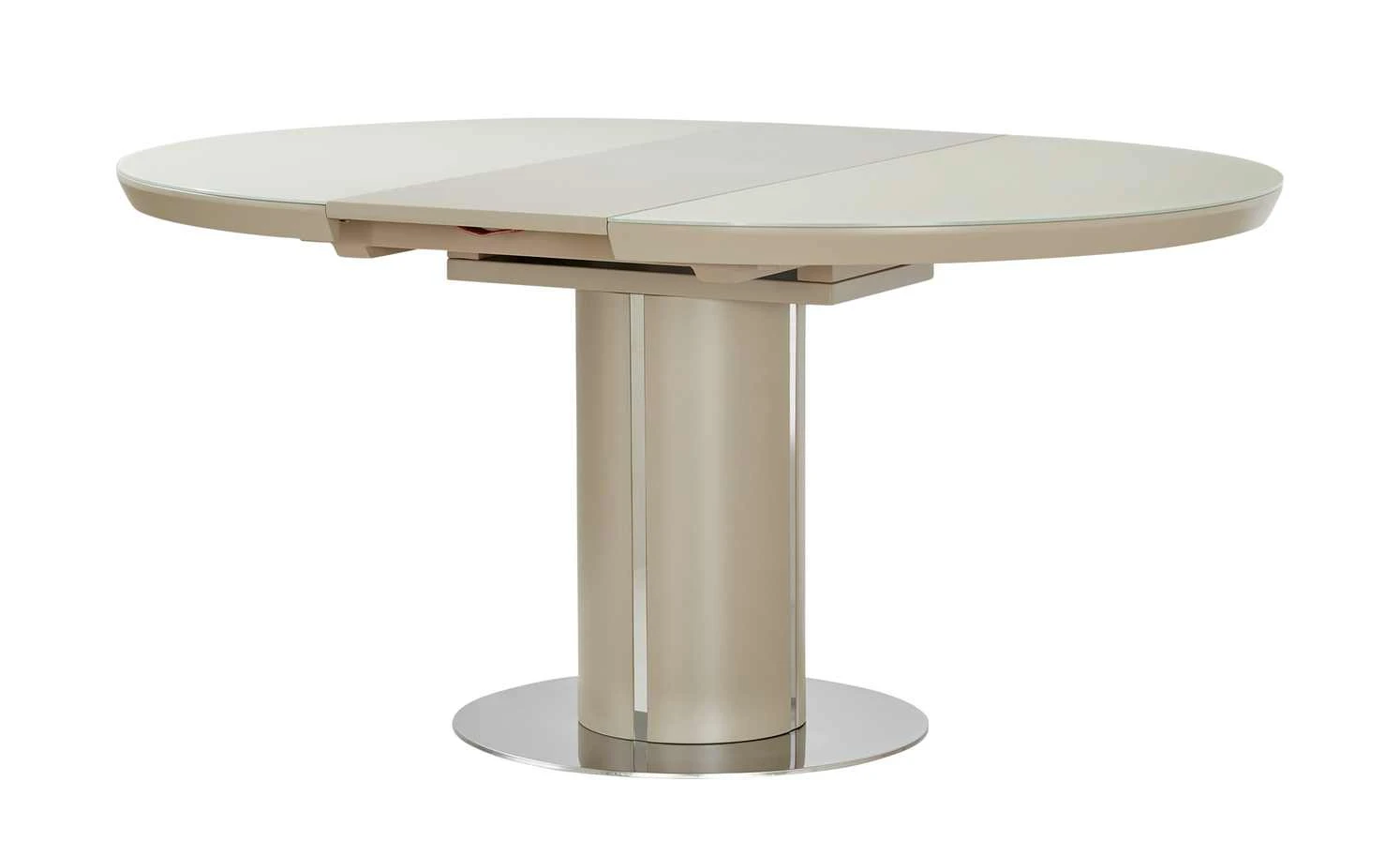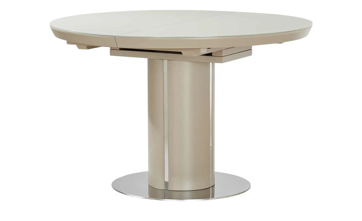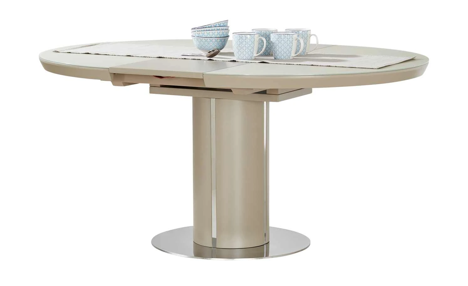 Rund oder oval – je nachdem, ob der Tisch ausgezogen ist oder nicht, ändert sich die Form der Tischplatte. Der Esstisch Dante kann durch den Mittelauszug einfach verlängert werden und so bis zu sechs Personen einen Platz bieten. Die Tischplatte besteht aus robustem Sandglas, das Sie, wenn nötig, einfach reinigen können. Der Tisch ist in Cappuccino-Beige gehalten. Die glänzenden Akzente aus Edelstahl sorgen für Highlights.