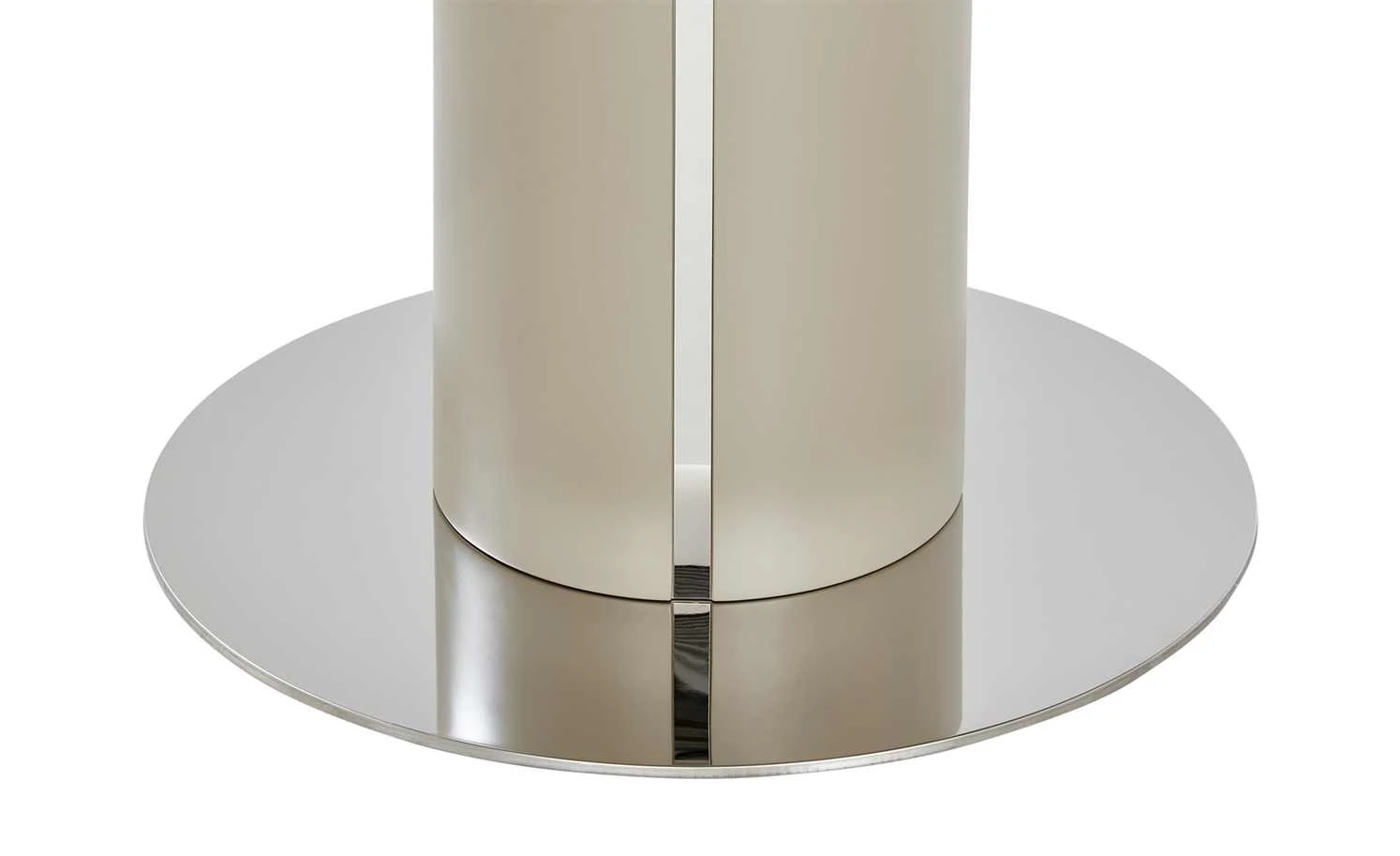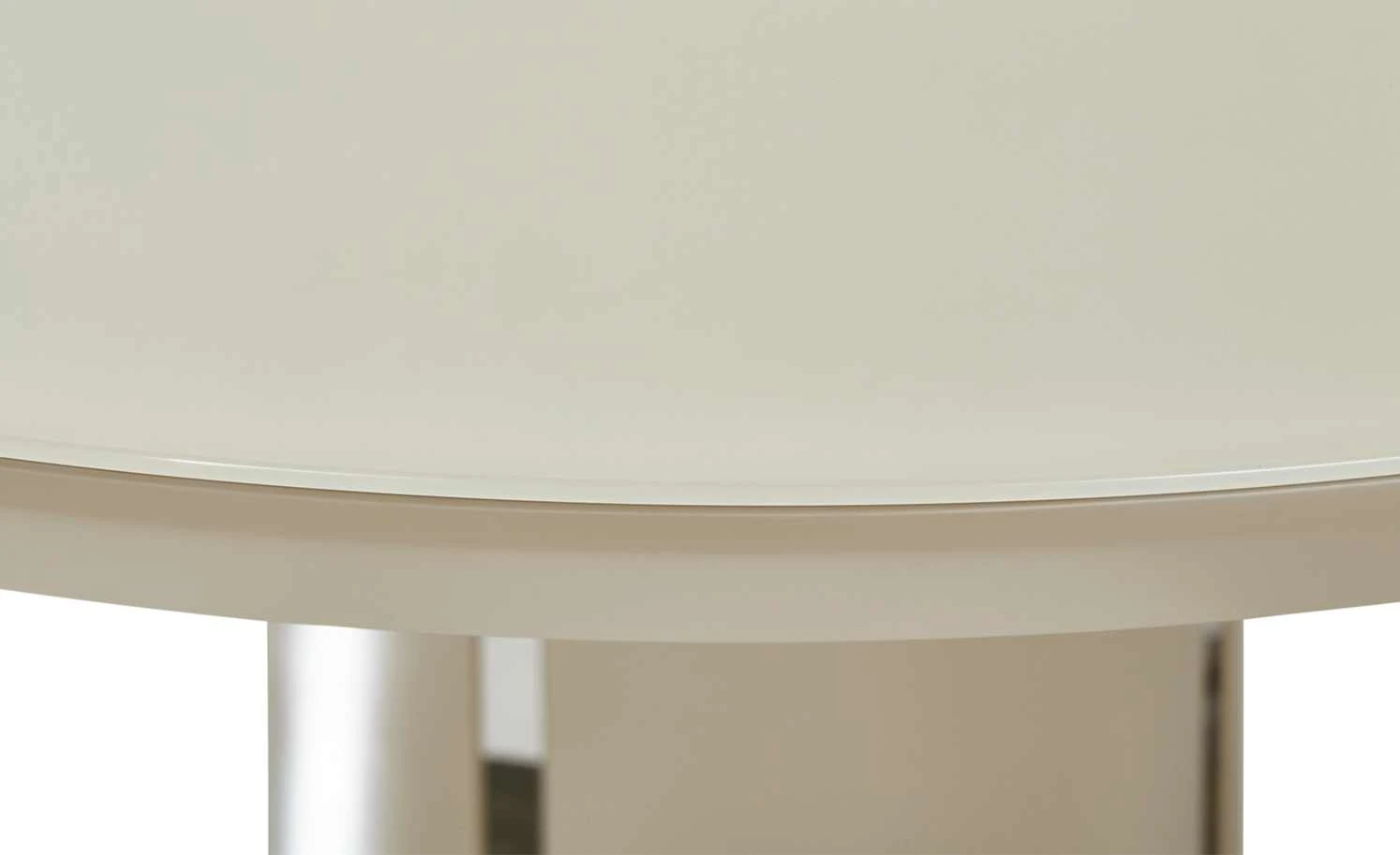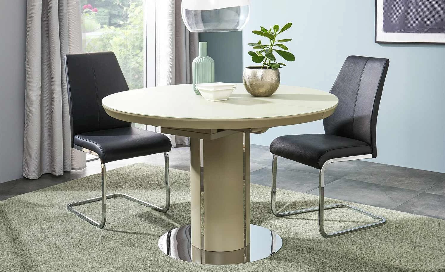 Rund oder oval – je nachdem, ob der Tisch ausgezogen ist oder nicht, ändert sich die Form der Tischplatte. Der Esstisch Dante kann durch den Mittelauszug einfach verlängert werden und so bis zu sechs Personen einen Platz bieten. Die Tischplatte besteht aus robustem Sandglas, das Sie, wenn nötig, einfach reinigen können. Der Tisch ist in Cappuccino-Beige gehalten. Die glänzenden Akzente aus Edelstahl sorgen für Highlights.