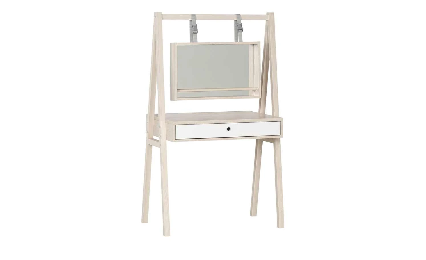 Ein frisches, junges skandinavisches Design hat der Frisiertisch Spot. Das Gestell aus akazienfarbigem Holz trägt die stabile Tischplatte samt Halterung für den Schubkasten. Tischplatte und Korpus sind ebenfalls in Akazie (Nachbildung) gehalten. Die Front des Schubfaches setzt sich farblich ab. An der Querstrebe des trapezförmigen Gestells wird der Spiegel mit zwei Schlaufen montiert.