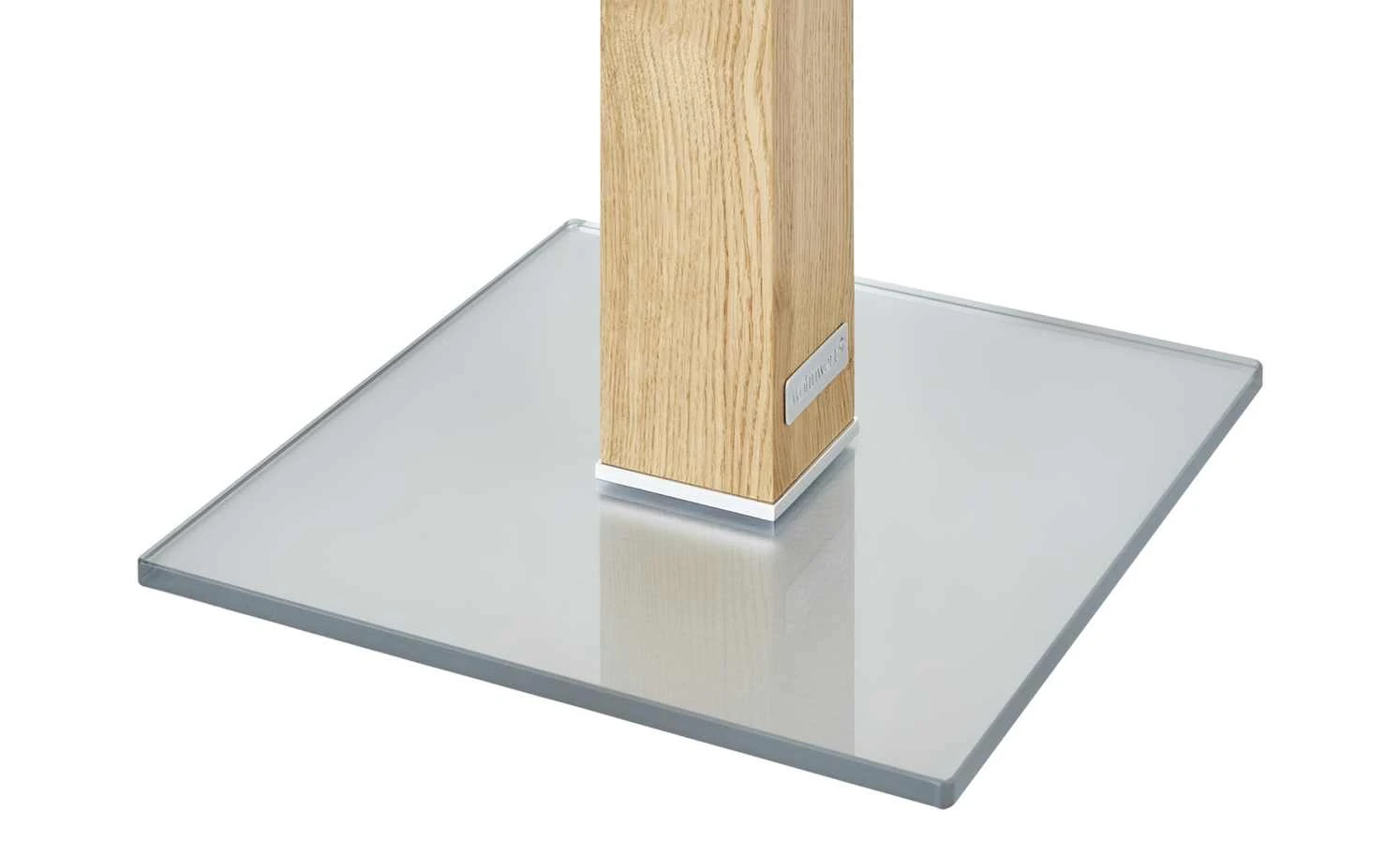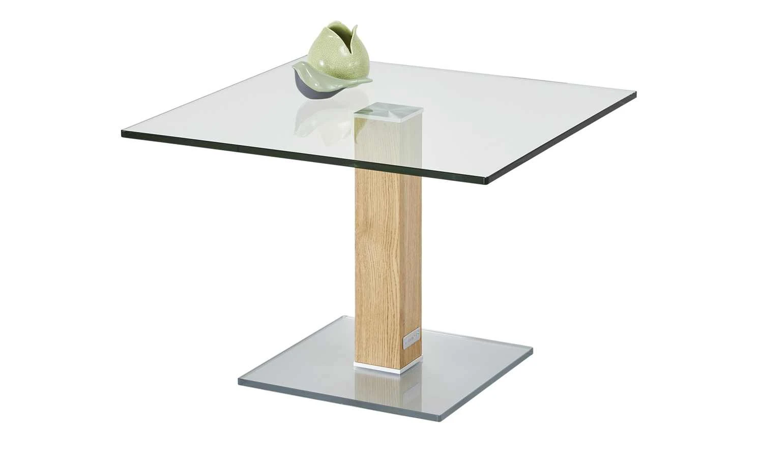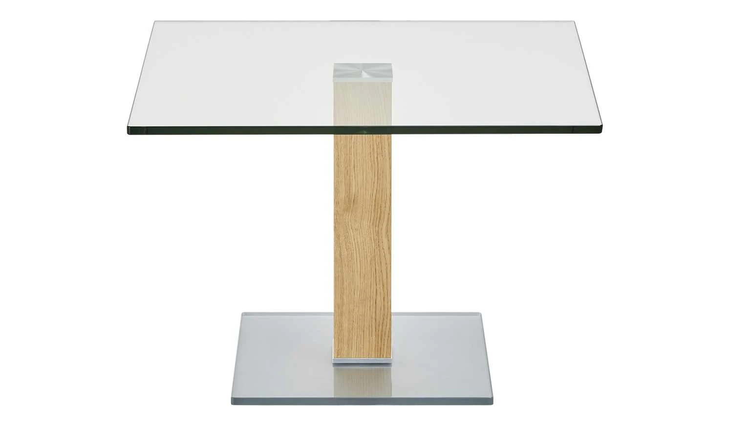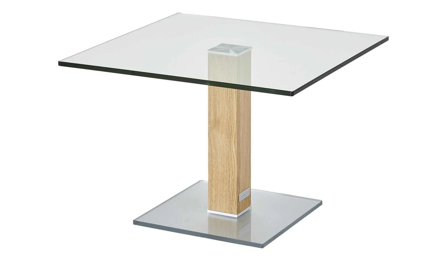 Neben der Couch, dem Sessel oder im Wintergarten – der Beistelltisch Quatro von Wohnwert ist praktisch und hat ein zeitlos elegantes Design. Tisch- und Bodenplatte sind aus stabilem Glas gefertigt. Bei der Tischplatte ist es klar, bei der Bodenplatte hat es eine weiße Optik. Das Gestell in Säulenform setzt sich ab. Es ist mit Wildeichenholz furniert. Das Holz verfügt über eine rustikale Maserung – und setzt so natürliche Akzente als Kontrast zum Glas.