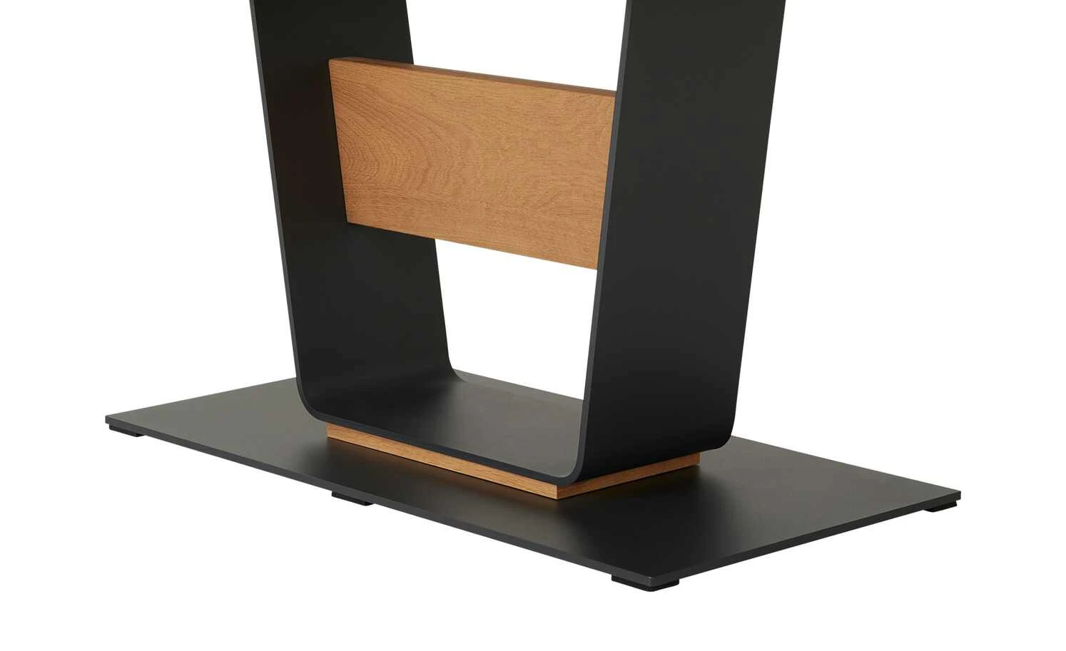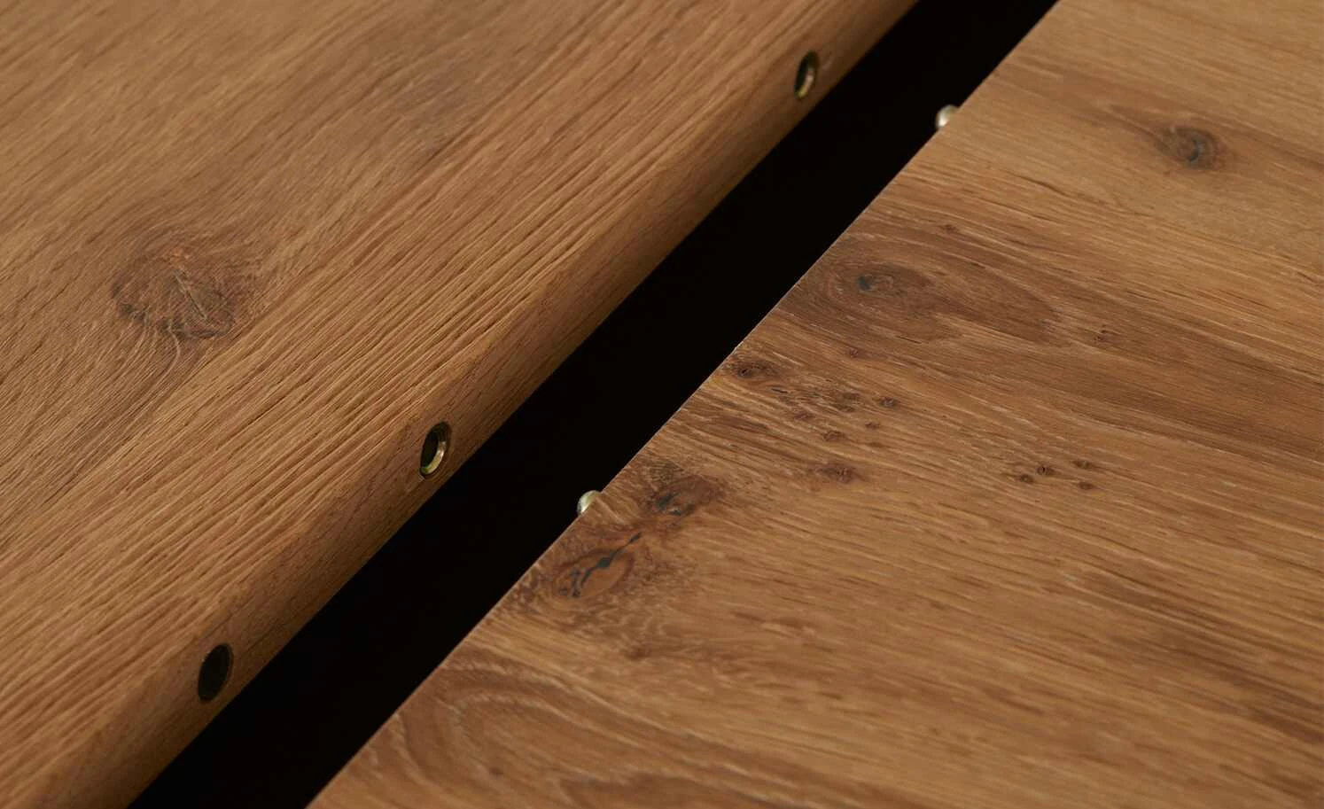 - Mehr zum Material: Applikation aus Baustahl, Anthrazit mit Holztraverse, Bodenplatte Metall, Anthrazit, Massivholz, Kerneiche Umato, gebürstet