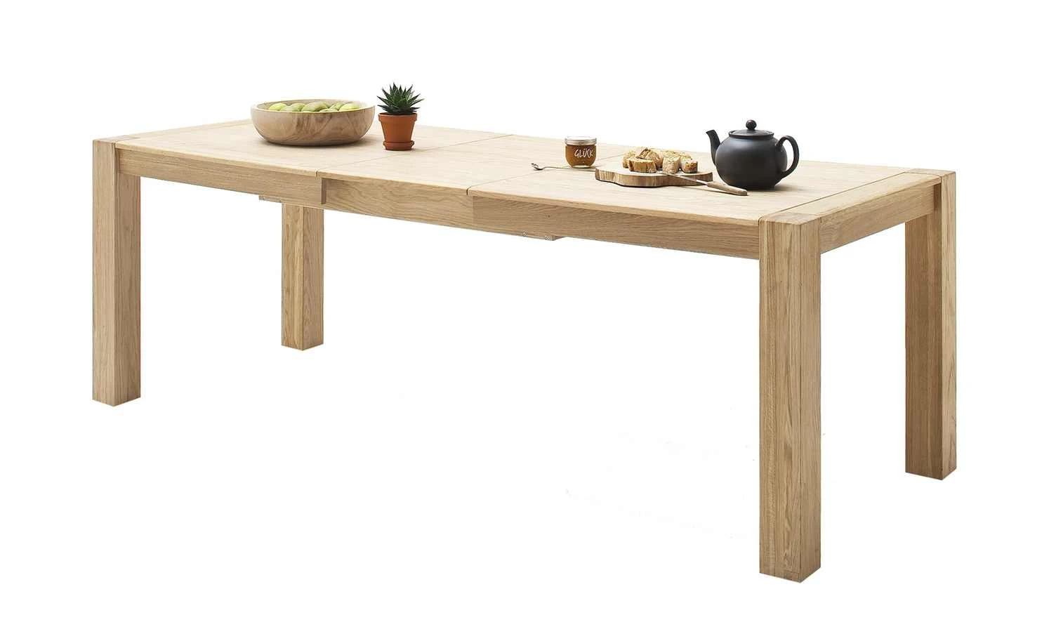 - Mehr zum Material: Tischzarge Eiche Bianco massiv, Tischplatte Eiche Bianco furniert mit massiven Anleimern