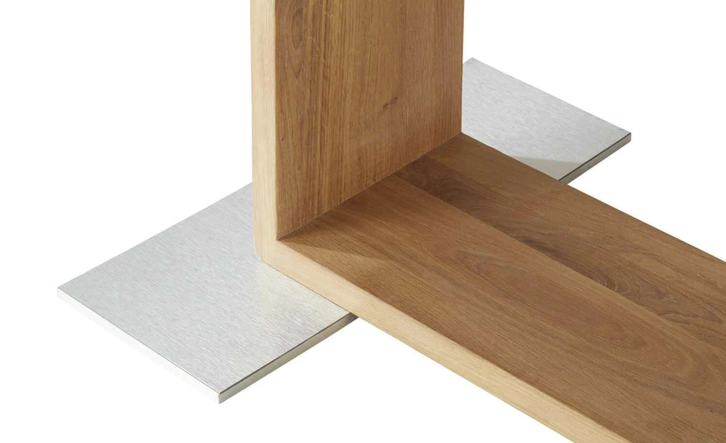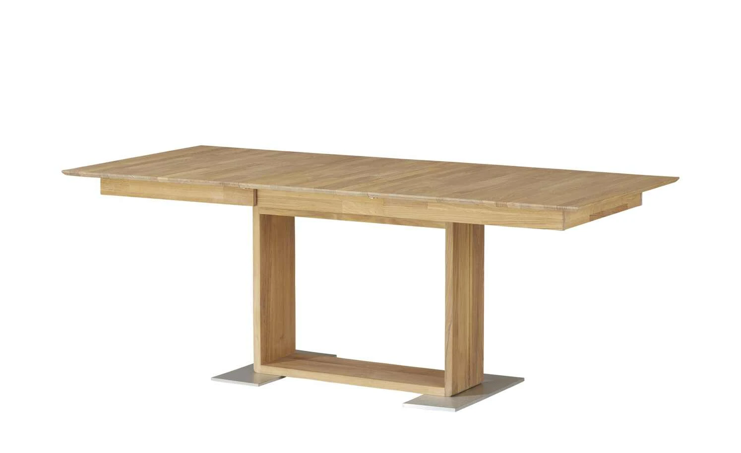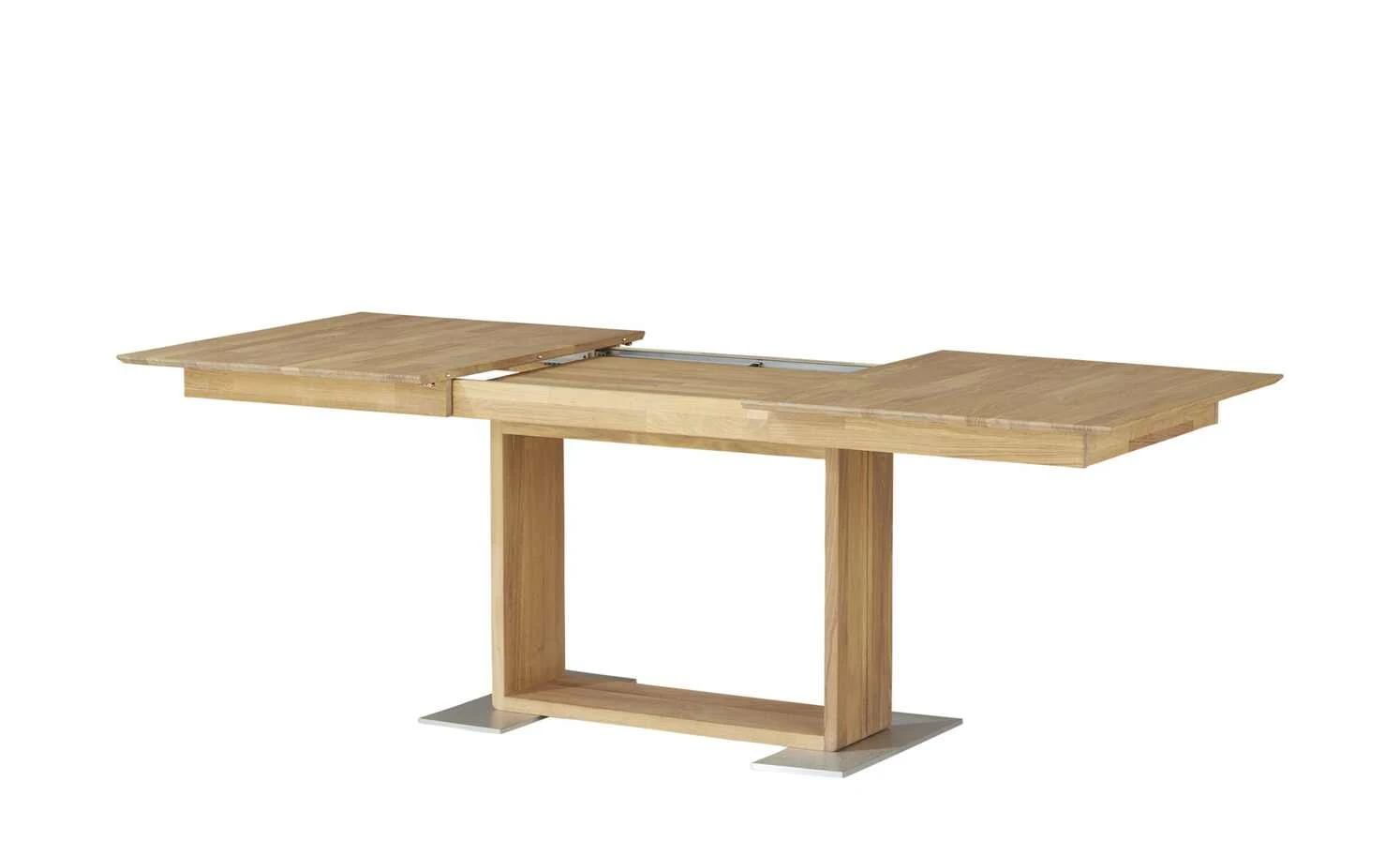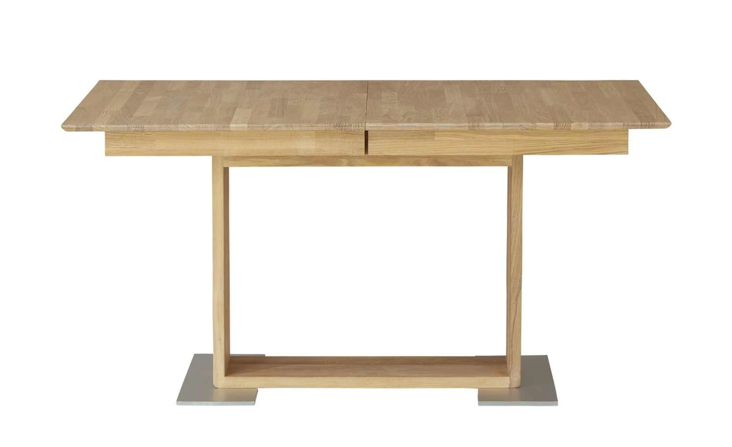 Wie viele Gäste Sie auch erwarten, mit dem Esstisch Mila sind Sie bestens vorbereitet. Mila lässt sich durch den praktischen Mittelauszug mit einer Einlageplatte ganz einfach verlängern. So können Sie die Größe des Tisches je nach Bedarf anpassen. Der Tisch ist aus hochwertigem Massivholz gefertigt und somit stabil und langlebig. Der natürliche Holzfarbton wird durch die Bodenplatte in Edelstahloptik geschmackvoll akzentuiert.