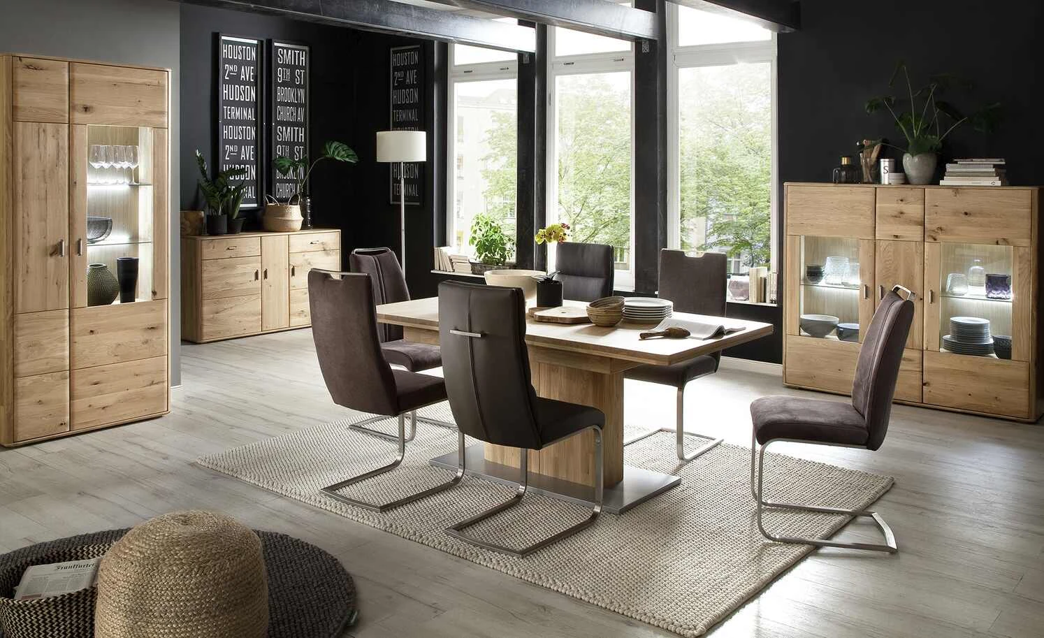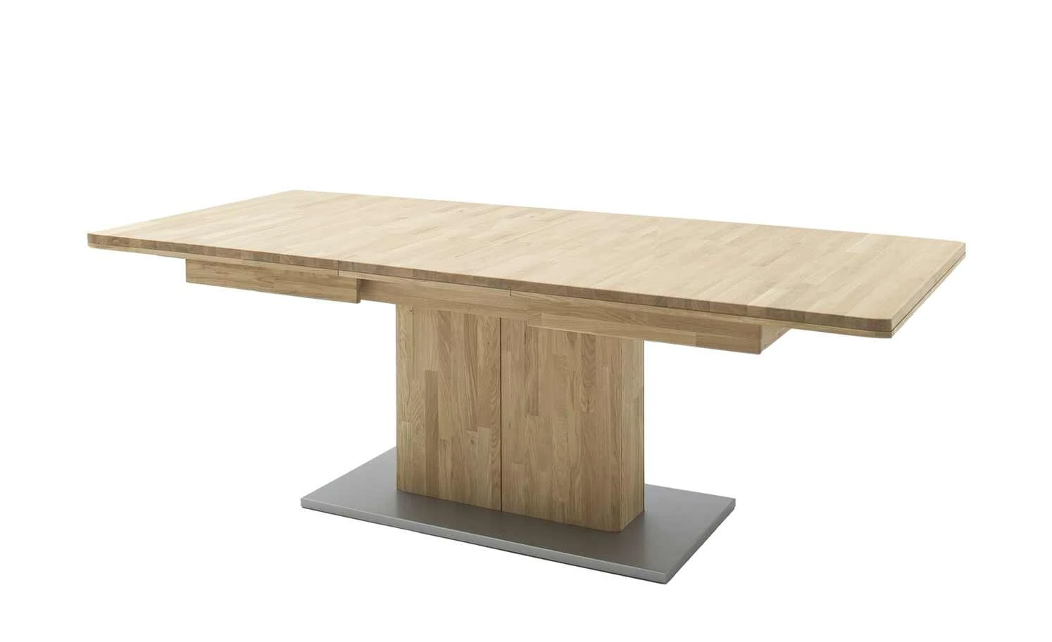 - Mehr zum Material: Tischplatte und -säule in Balkeneiche Bianco (keilverzinkt), Bodenplatte in MDF (mitteldichte Holzfaserplatte) metallfarbig Grau lackiert